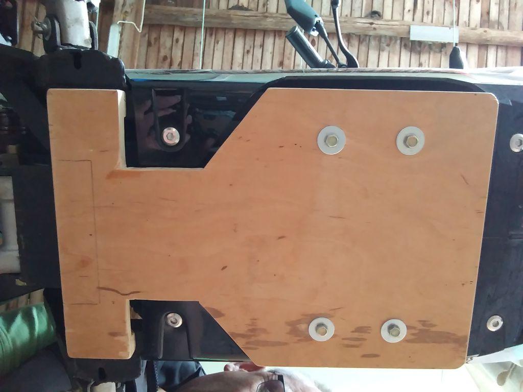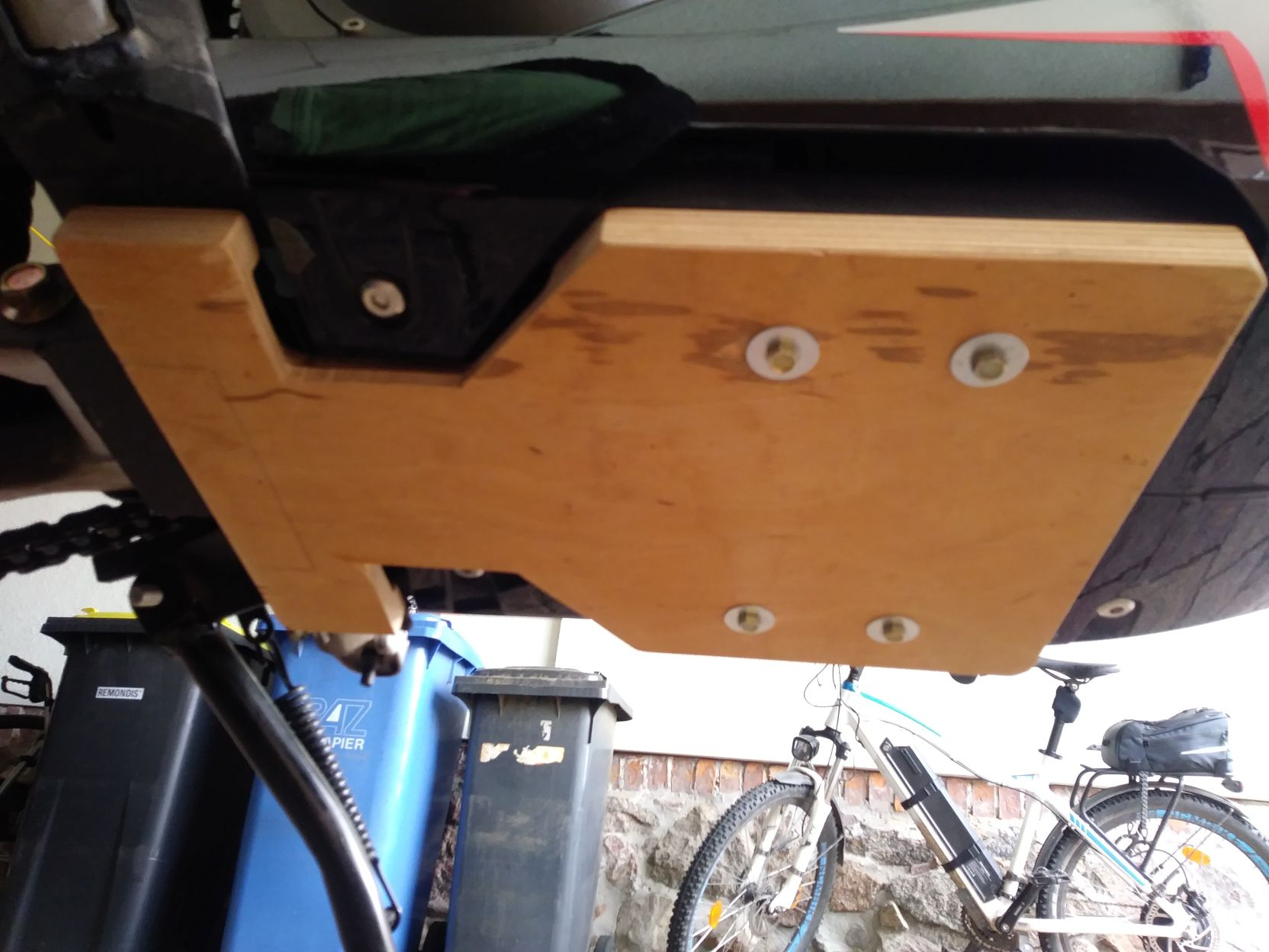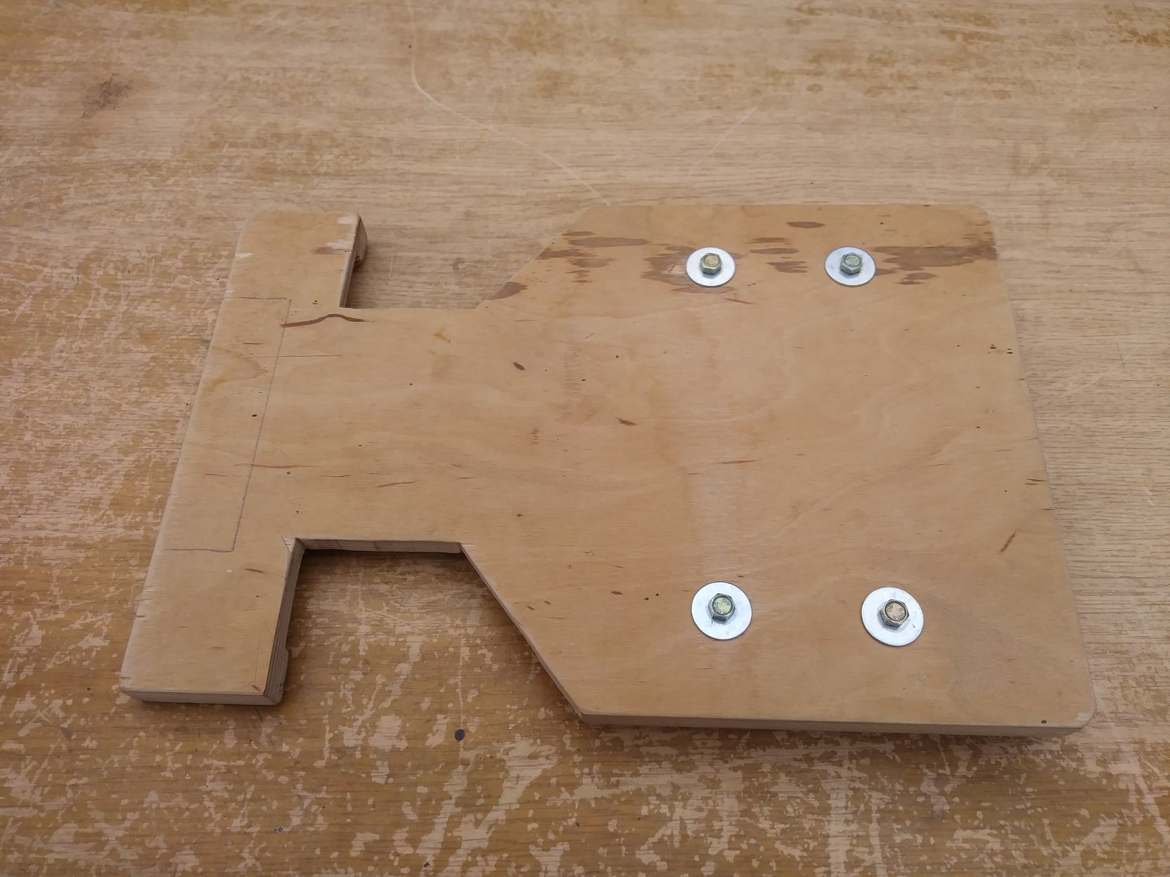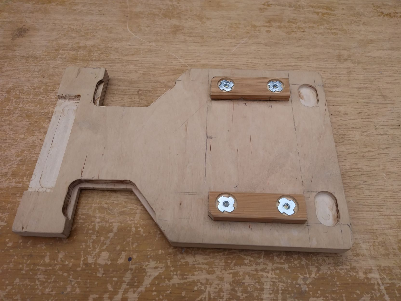 Das jetzige "Adapterbrett" erhält noch eine Aufdopplung aus Multiplexplatte als "einfaches, rechteckiges Brett" mit dem gleichen Außenmaß und 4 Bohrungen, die die vier Schraubenköpfe aufnehmen und somit eine völlig glatte Unterseite entsteht.