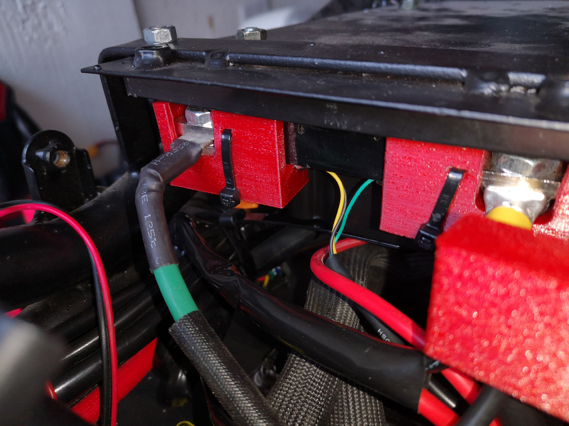 Die verwendeten WACO-Klemmen und der Shunt wurden dann noch mit selbstgedruckten Schutzkappen (aus rotem TPU) versehen.