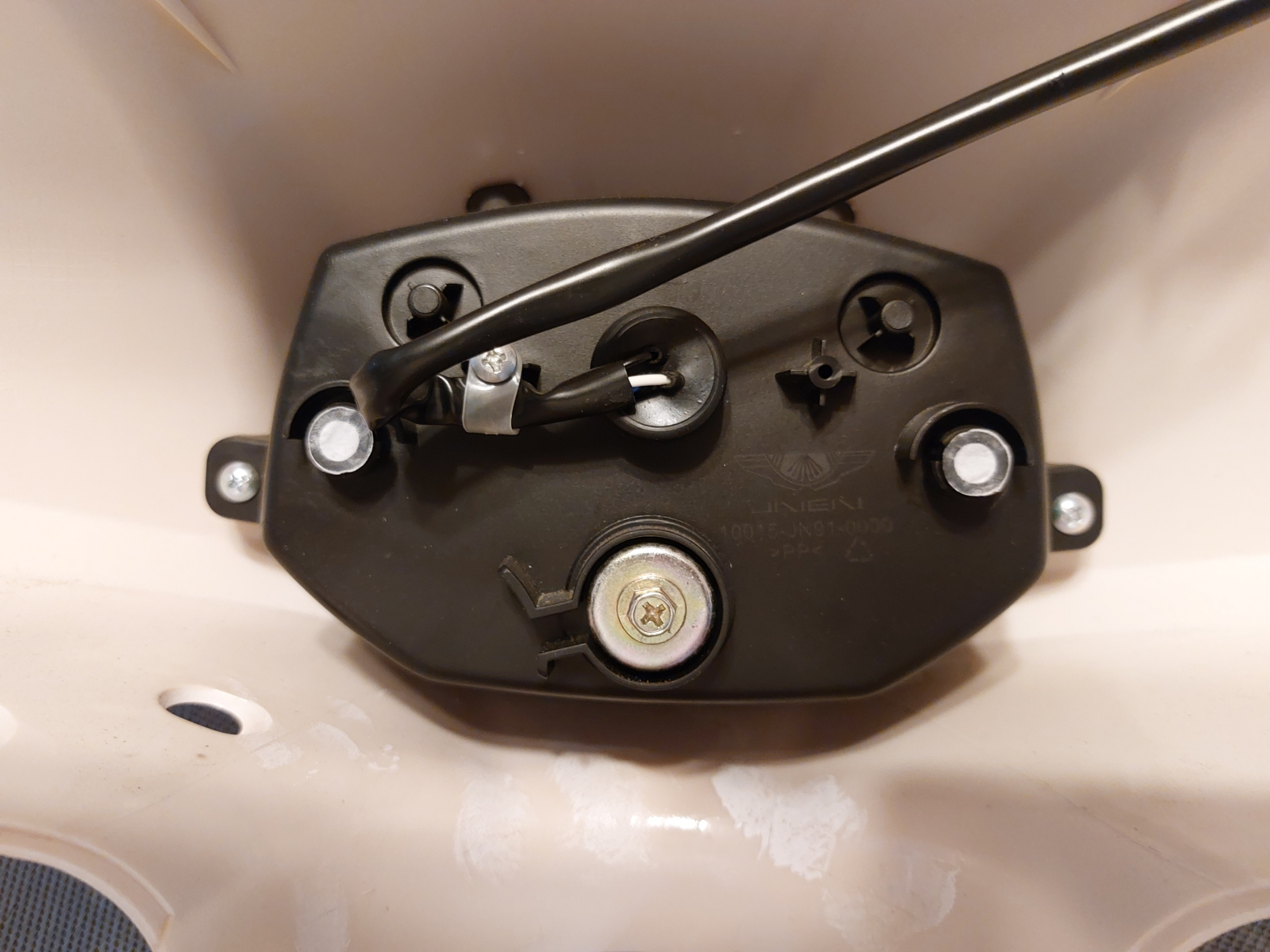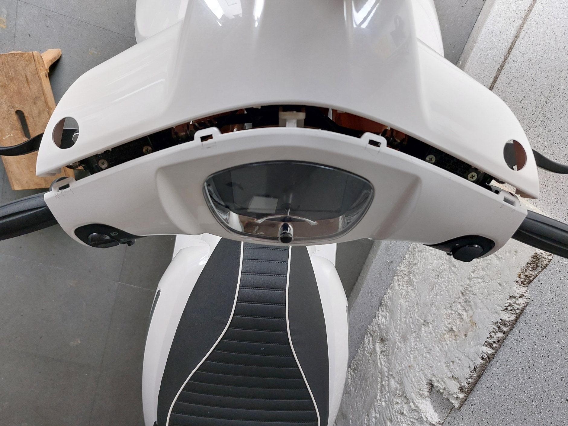Zuerst müssen die Spiegel entfernt werden. An der Lenkerverkleidung befinden sich vier sichtbare Schrauben die entfernt werden müssen. Eine rechts und eine links vom Lenkkopf und zwei sieht man wenn man in Fahrtrichtung schaut, rechts und links unterhalb der Griffe. Anschließend muss die vordere von der hinteren Verkleidungshälfte getrennt werden. Dazu an der oberen Trennlinie der beiden Hälfte mit einem kleinen Schraubenzieher an den im Bild erkennbaren Laschen dazwischen gehen. Für weitere Versuche habe ich die Stellen bei mir mit einem weichen Bleistift (4B) markiert. So kann die vordere Hälfte der Lenkerverkleidung inklusive dem darin eingebautem Scheinwerfer abgenommen werden. Mittig in der unteren Hälfte des Scheinwerfers befindet sich eine Kreuzschlitzschraube die auch mit einer Sechskantnuss bedient werden kann. Drehen im Uhrzeigersinn dreht den Lichtschein nach oben. Ich habe die Verkleidung mit angeschlossenem Scheinwerfer und eingeschaltetem Licht auf einen Hocker im Fahrerfußraum gelegt und festgehalten. Dreht man nun an der Schraube sieht man wie sich der Lichtschein nach oben schwenkt.