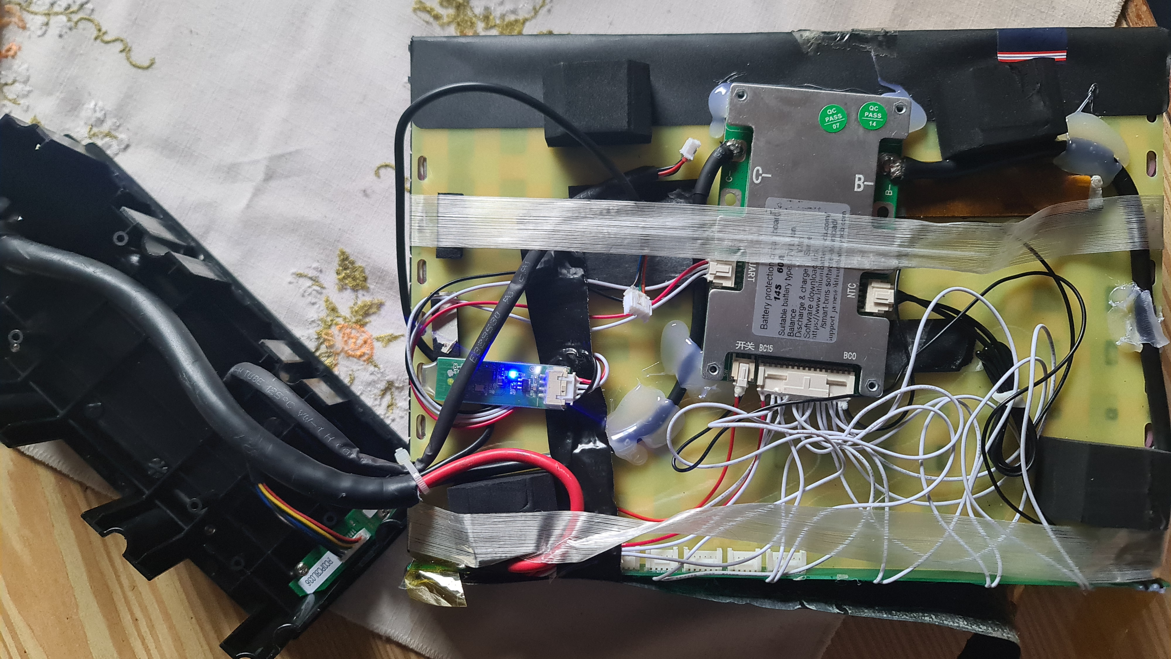 Soweit ich weiß, hat die Verkäuferin den Akku, weil er nicht mehr zu laden war, zur Reparatur gegeben. Am Unu wurde soweit ich weiß nichts gebastelt. Vom BMS gehen alle Kabel zu den einzelnen Batteriegruppen. Aber zur Batteriebuchse sind nur Plus und Minus am BMS angeschlossen.