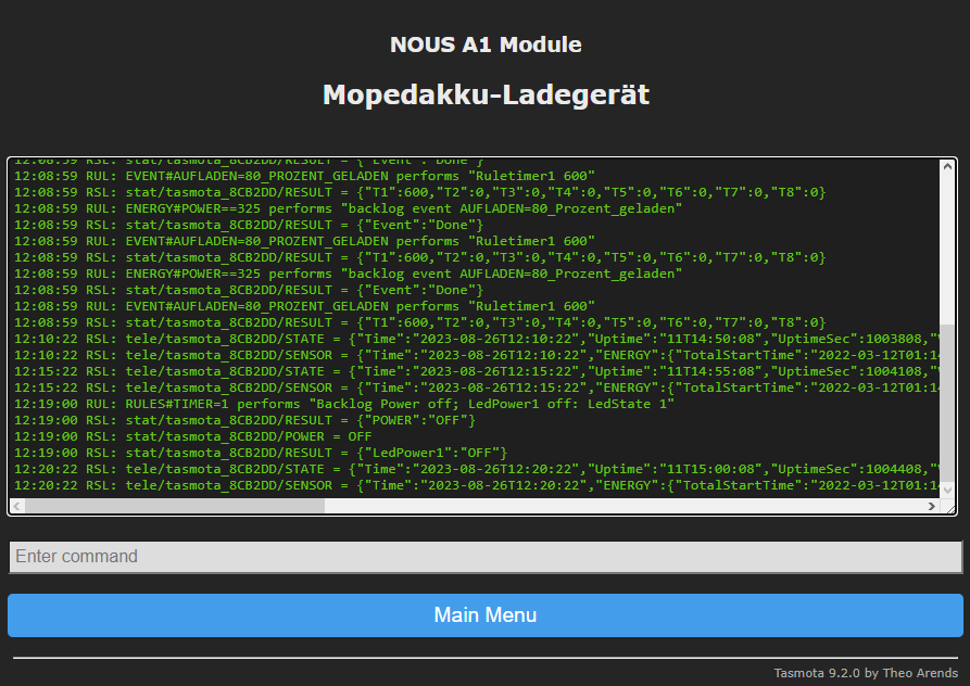 An eine Steckdose im Haus anschließen, mit dem Handy in das WLAN der Steckdose verbinden laut Anleitung. Steckdose bei euch ins WLAN bringen. Über die dann erhaltene IP-Adresse (ggf. im Router nachschauen, was für eine IP-Adresse er zugewiesen hat) mit der Steckdose erneut verbinden und meine Regel (siehe Code unten) über die Console einfügen und mit Enter abspeichern. Danach mit dem Befehl "rule1 1" die Regel aktivieren und losladen! Über die Webseite kann man immer mal kontrollieren, wie weit schon geladen ist (in Watt). Und über die Console hat man ein Live-Log, dann sieht man wann welche Timer losgehen. Sieht merkwürdig aus, weil sich die Zeilen oft wiederholen, das ist aber der Skriptsprache und dem verhalten der Firmware geschuldet, aber funktioniert prima. Und man kann beruhigt am Ende der Moped-Saison die Batterie auf nur 80% aufladen und hat im nächsten Frühling eine gut erhaltene Batterie, die nicht den ganzen Winter bei 100% sich selbst geschadet hat. Das manuelle herunterfahren, was wetterbedingt nicht immer möglich ist, entfällt also.