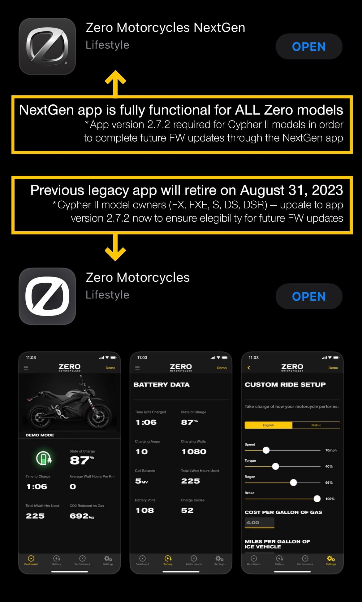 If you own a Cypher II model and have not updated the firmware on your bike, now is the time. The older legacy Zero app will be permanently retired August 31, 2023, and in order to be eligible for future firmware updates through the new NextGen app, you will need to have the most recent app version (2.7.2) installed. Failure to complete this prior to August 31 means you will be required to visit a local dealer to manually update your MBB/BMU/BMS firmware to the latest version to ensure future firmware update eligibility through the NextGen app.