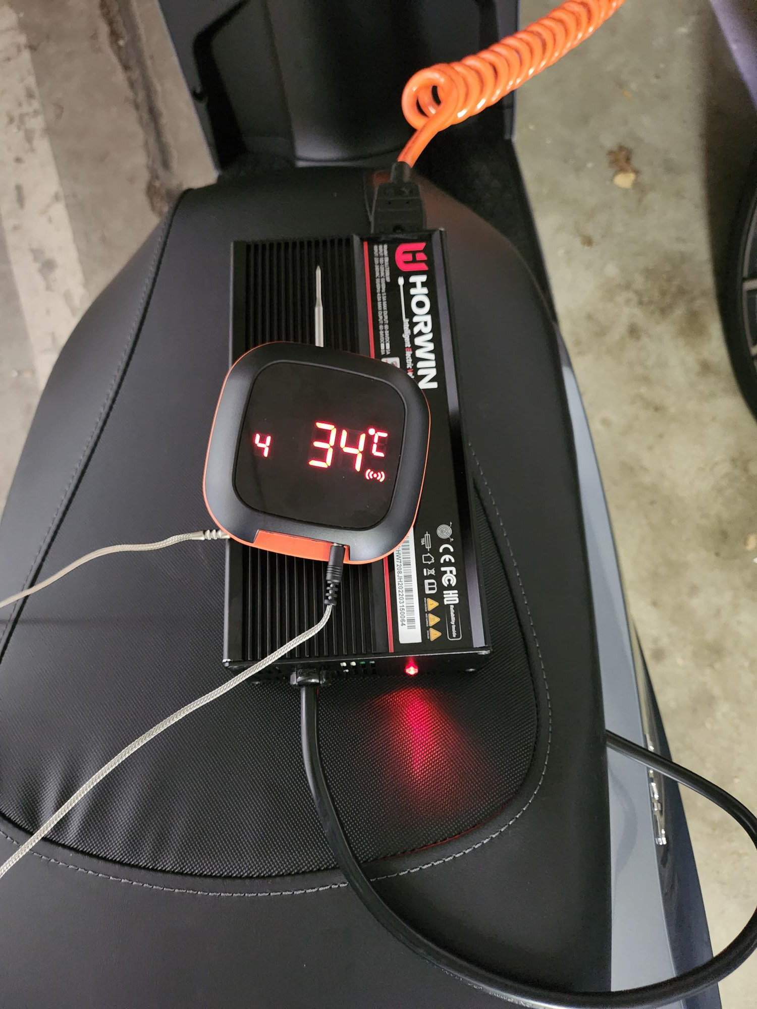 Ich habe heute mal einen Probelauf gemacht und dabei die Temperaturen gemessen. Ein Mal außen, auf dem Sitz, eine zweite Sonde war innen unter den Sitz geklebt und schließlich eine auf dem Ladegerät.