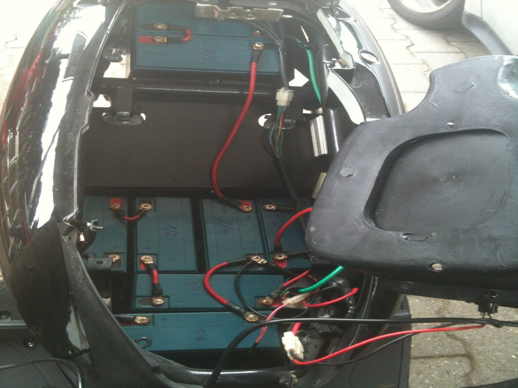 Danke für die fixe Antwort. Aus dem Bild kann ich die Verschaltung nicht genau genug erkennen (zumal meine Akkus anders angeordnet sind: 3 länglich und 2 quer unter der Sitzbank und 3 quer am Boden unter den Füßen). Aber die Info, dass es jedenfalls 2 x 4 Akkus sind, ist schon mal sehr hilfreich!