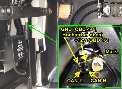 Wie Gerold schon vor Jahresfrist feststellte, ist ein Fehler in manchen kursierenden Plänen: Neben GND (OBD 4,5), CAN-L (14), CAN-H(6) liegt dort eben NICHT +12VUI (die Dauerstromversorgung des Astra-Moduls) an, sondern OBD(16), also zündungsgeschaltetes +12V, die interne diverse Allgemeinstromversorgung. Das ist erst in der Schaltplanversion "S01_v5" vom 15.3.2022 korrekt eingezeichnet, die Vorversion "S01_v3" vom 28.1.22 dürfte schon nicht mehr aktuell gewesen sein, weil mein Roller m.a.S.g.W. Ende 2021 oder Anfang 2022 fertiggestellt wurde (EZ 2/22).