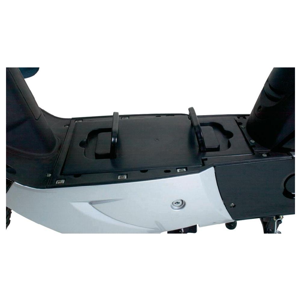 Staufach (Wanne) unter der Sitzbank. Da passen locker 30 Ah LiPo rein, die ja nicht so groß sind, wie das Bleiakkupack. Und noch mehr Stauraum im Topcase: