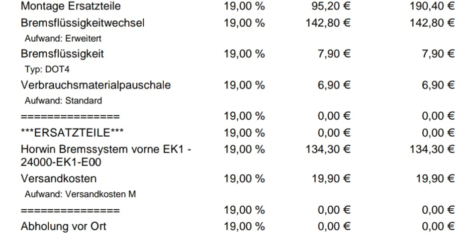 Zum Thema Kosten habe ich mal eine der 2 berechneten Arbeitsstunden für den Wechsel der Bremsflüssigkeit mit eingerechnet also, nagut, sind wir trotzdem noch bei knapp 255€.