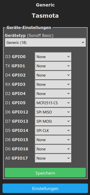 Nach dem Flashen muss Tasmota noch konfiguriert werden. Dazu wird im Webbrowser unter dem Reiter "Einstellungen --> Gerät konfigurieren" die Geräte-Einstellung wie folgt vorgenommen. Falls der CS-Pin des MCP nicht am GPIO5 des ESP's angeschlossen wurde, muss dies hier geändert werden.