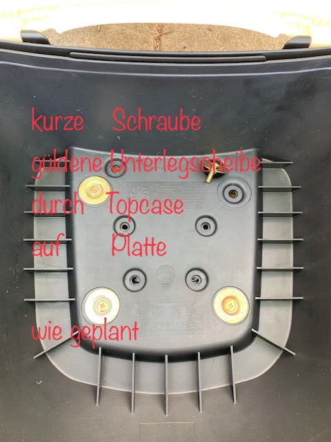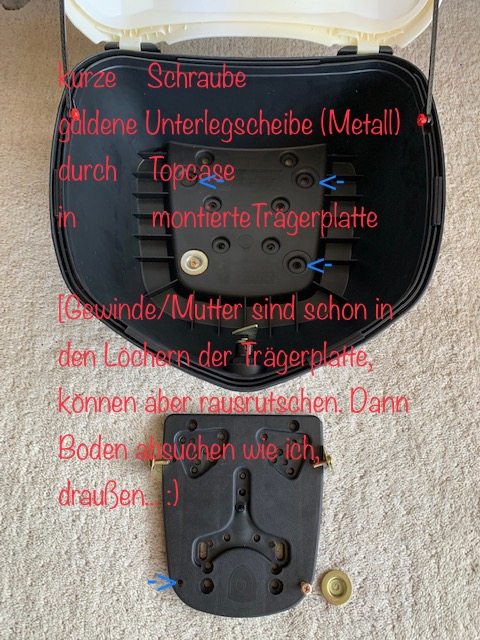 Bei Youtube gibt's zwar etliche Videos, aber superlang, z. B. 22 (!) min., und/oder nicht zu meinem Topcase mit meinem Zubehör, lange und kurze Schrauben etc... [Es ist für mich auch IMMER ein Rätsel, wo eigentlich genau so eine Unterlegscheibe hingehört. Das habe ich dort auch nicht gesehen.] Nach einigen Videos (und einer Homepage über Unterlegscheiben