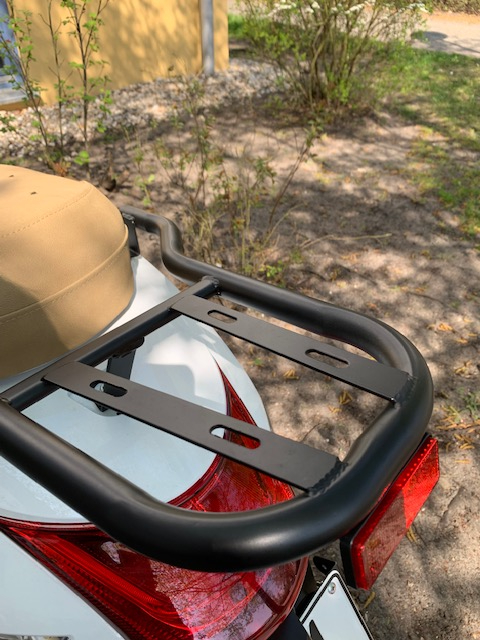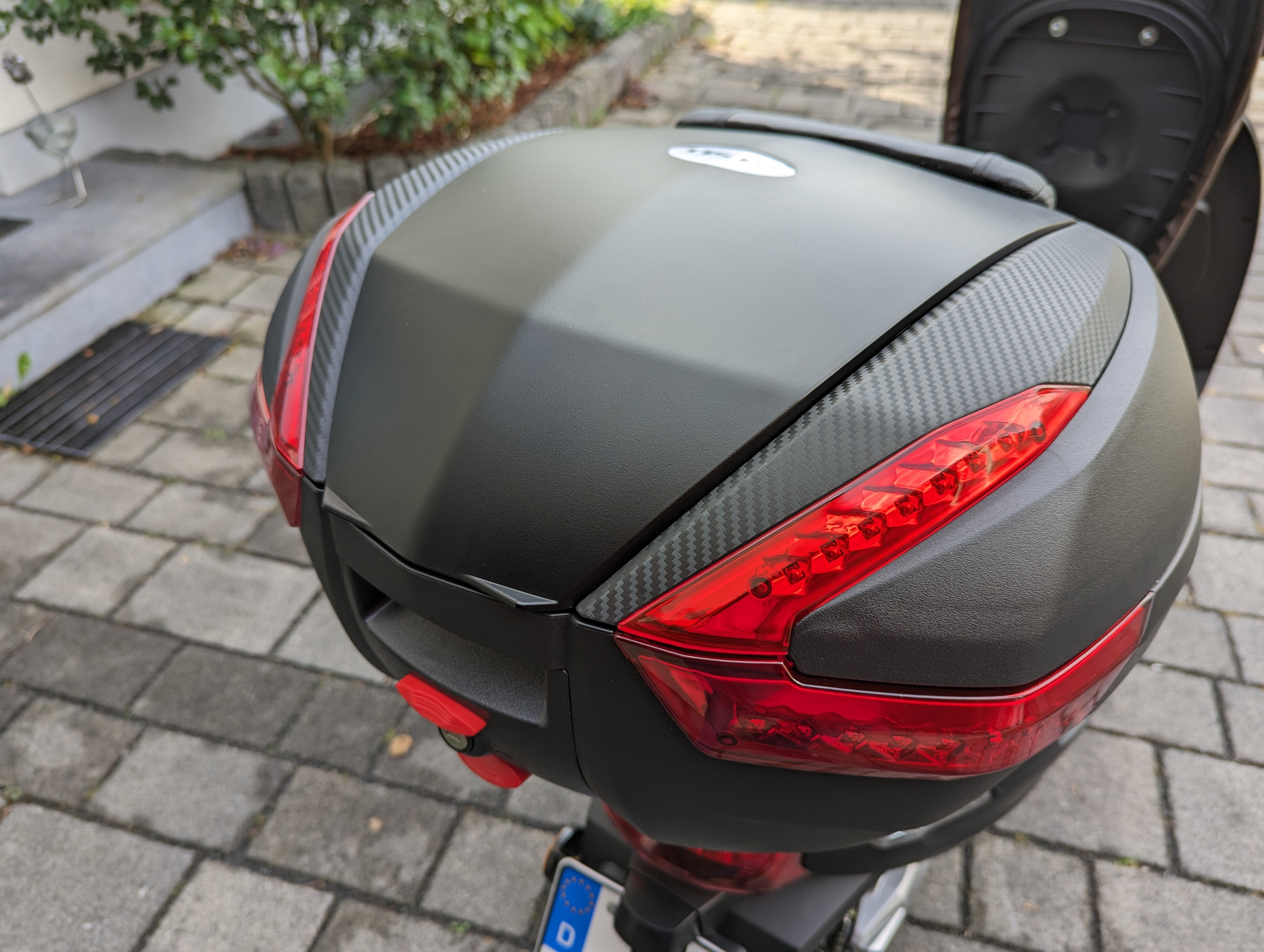 Heute ging's ans Montieren des Topcase - gleich bei Tisto mitbestellt - obwohl sie pur auch sehr gut aussieht. Aber durch die Riesenakkus bleibt nicht so sehr viel Stauraum, Helm schwierig...