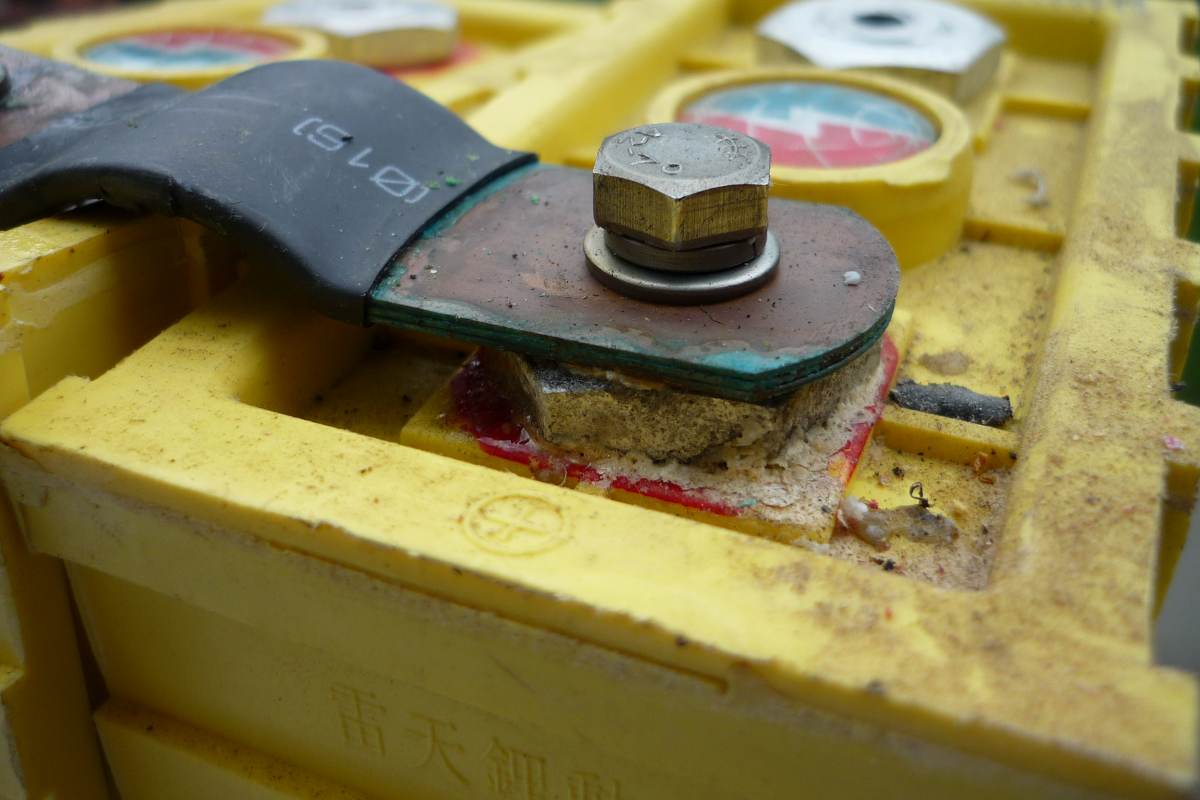 Und hier sehen wir mal die Korrosion an der zweiten Zelle. Man kann sich lebhaft die Übergangswiderstände vorstellen. Mal wieder die Rechnung: wenn der Übergangswiderstand nur 0.1Ohm hat, dann gehen uns bei 50A (fast Vollgas) gleich 5V flöten. Das bei zwei Zellen, und dann wird klar, warum der Controller nach wenigen Kilometern abschaltet. Der hat bei ca. 40V keine Lust mehr zu arbeiten. Da müssen die Zellen nichtmal einen großen Kapazitätsverlust haben, die Reichweite vom Neuzustand wird schon durch die Korrosion zunichte gemacht.