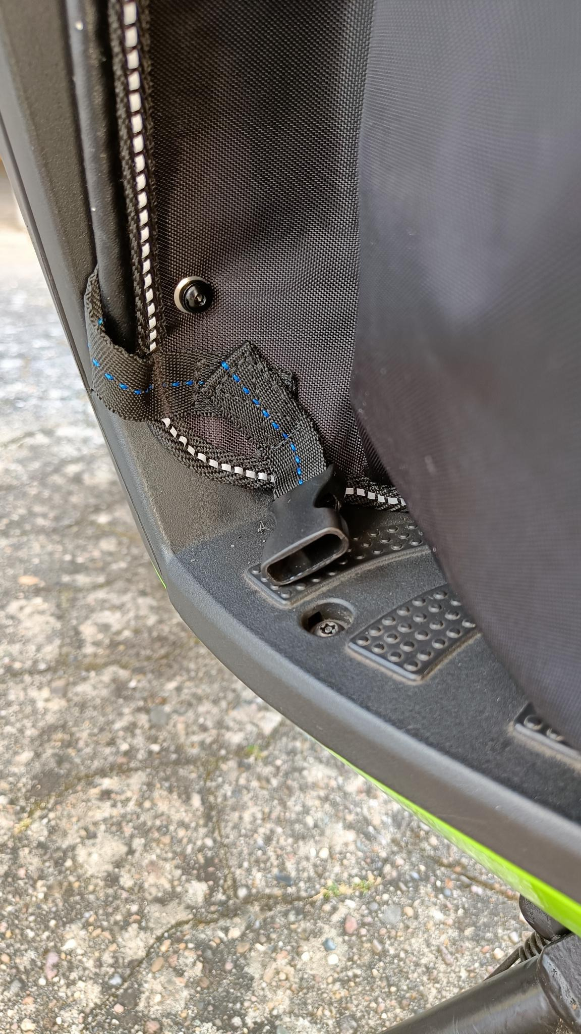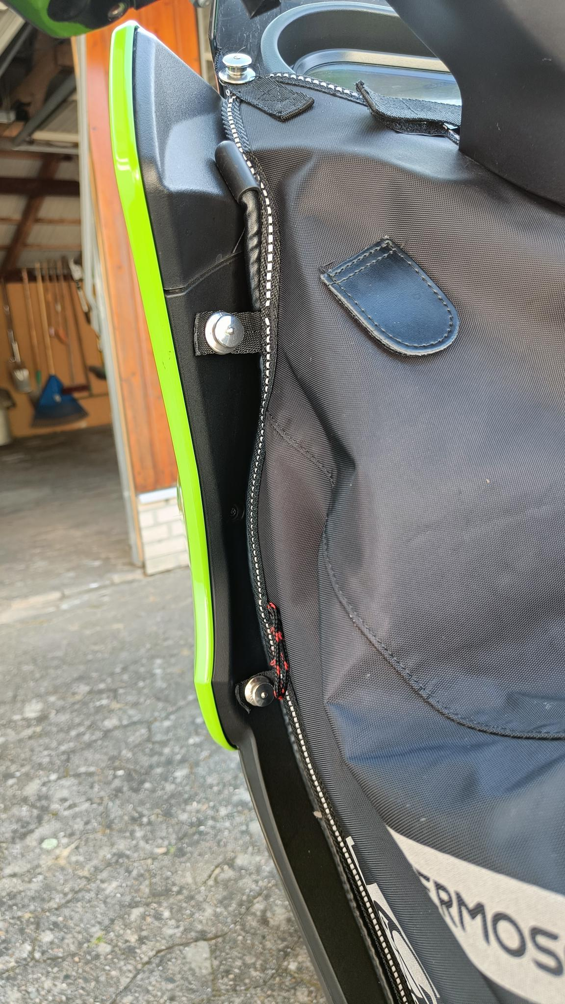 Die erste Probefahrt hat nun keinerlei Windzug unter dem Schutz erzeugt (war so gehofft), jedoch hätte ich doch 1 bis 1,5 cm weiter nach außen gehen können mit der Mutter. Der Platz für die Schuhspitzen wird durch diese Befestigung etwas enger aber war kein Problem. Auch das "Einsteigen" hat so funktioniert. Im Sommer kommt dann ein kleiner Stopfen in das Loch und es fällt nicht weiter auf.