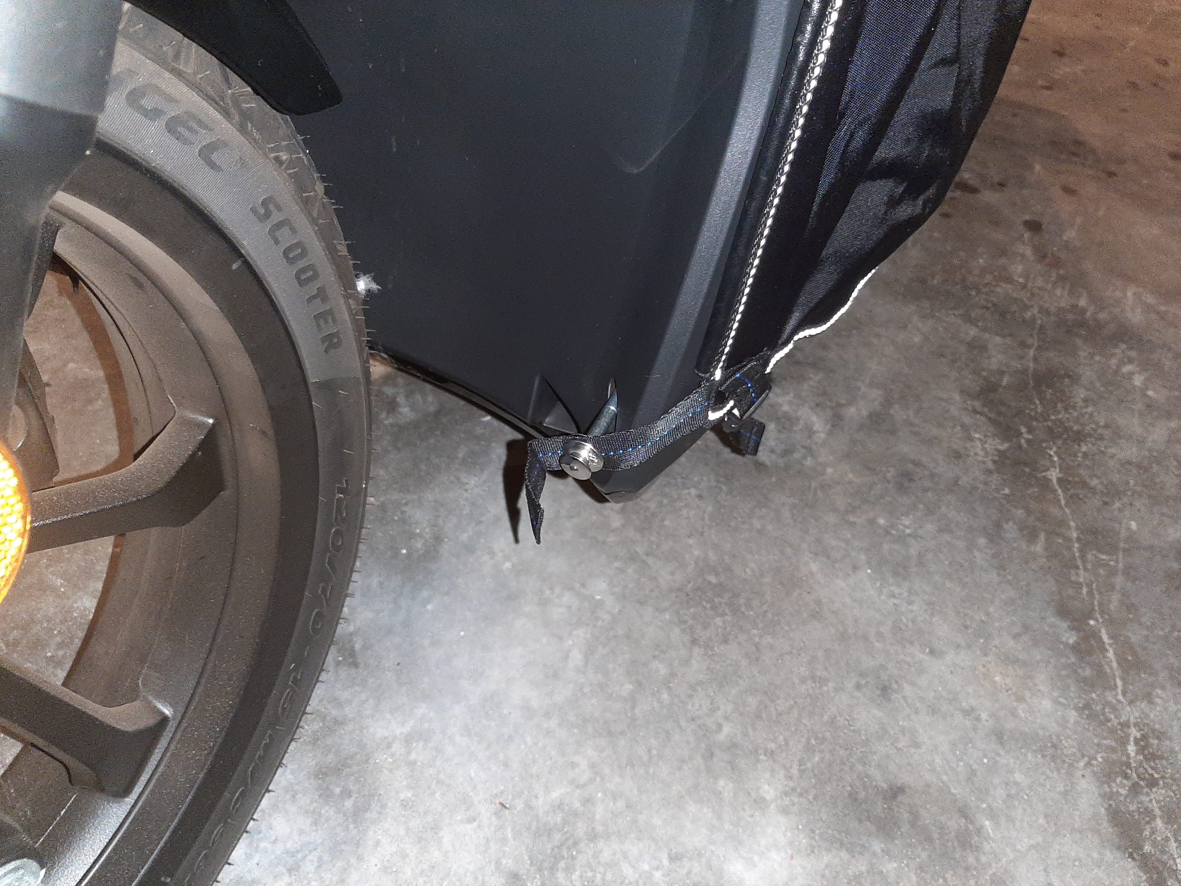 Der Herbst naht und auch ich habe nun meinen Beinschutz montiert und bei der Gelegenheit auf die Variante mit der LOXX Befestigung umgestiegen. Da bei mir einige Blechmuttern überdreht wurden oder sich gelöst hatten, habe ich diese auch gleich getauscht. Für die untere Befestigung habe ich jedoch eine andere Variante gewählt, da ich die Verlängerung im Radkasten optisch nicht so toll finde und der Gurt unter dem Roller die Verkleidung zerschrammt. Durch die Originalbefestigung ragt der Beinschutz nach vorn über die Kante der Verkleidung und somit wird Wind und Wasser vom Vorderrad unter den Beinschutz geleitet.