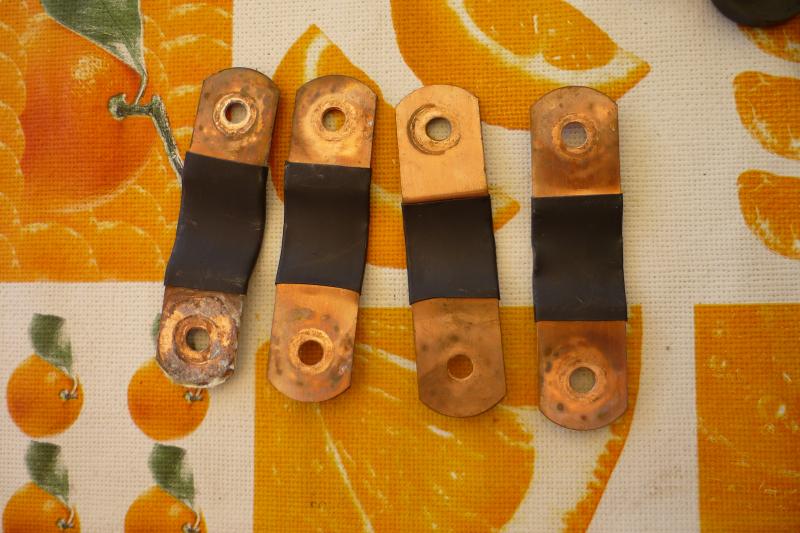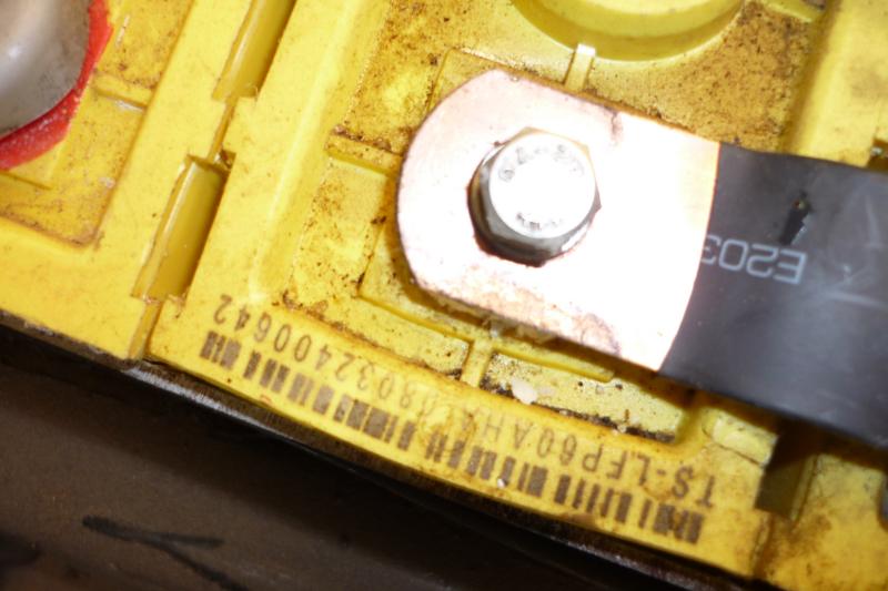 Und so sehen dann die Zellverbinder von unten aus, einer von der suppenden Zelle zeigt deutliche Spuren. Da die Korrosion auch zwischen die Kupferbleche gekrochen ist, wird dieser Verbinder lieber gleich ersetzt, ich habe genügend Ersatz mitbestellt. Alle anderen werden mit 1000er Schleifpapier auf Vordermann gebracht.