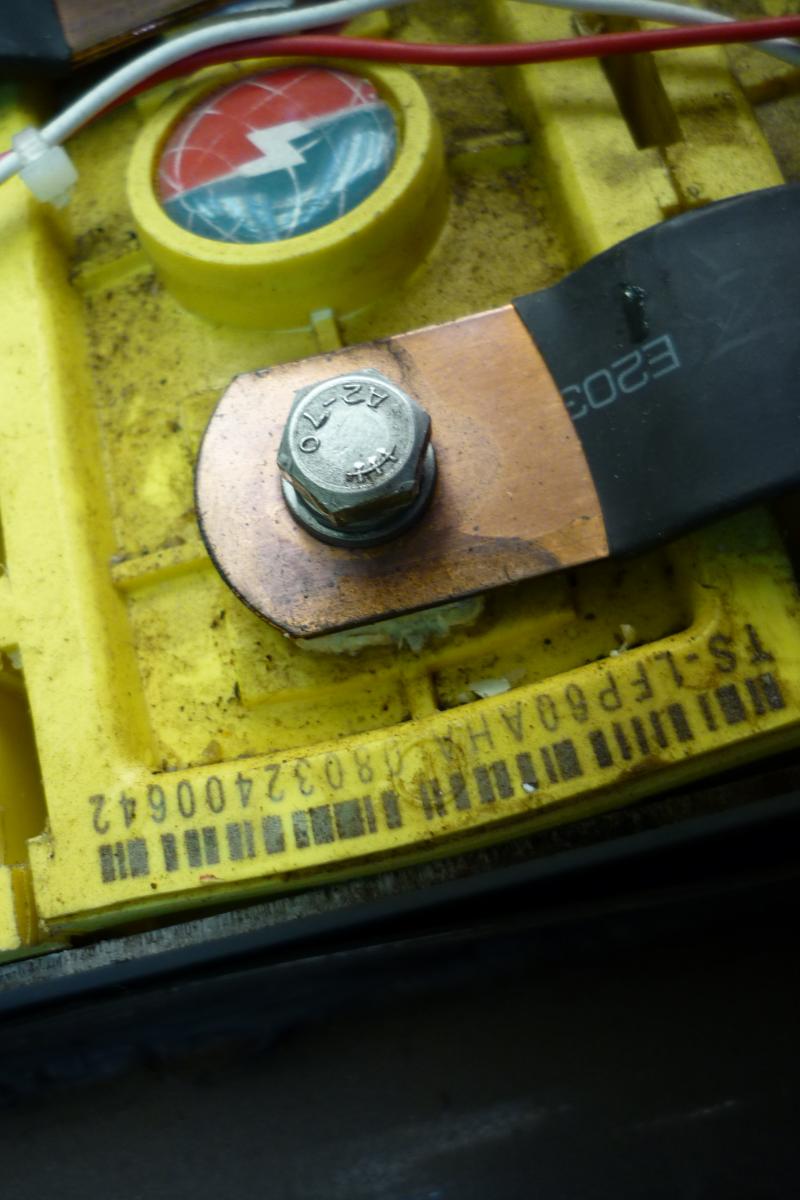Sobald der Pol einer Zelle freigelegt ist, kommt sofort eine Isolierung drauf. Beim Lösen der Zellverbinderschrauben wird vorher überlegt, in welche Richtung der Zellverbinder mitdrehen möchte, wenn er denn könnte, und in welcher Richtung es am wenigsten gefährlich ist.