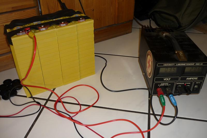 Wir benötigen pro Zelle voraussichtlich 20Ah, macht zusammen 80Ah, macht bei 2A Ladestrom rund 40 Stunden, der Spaß wird also von Freitag abend bis gut Sonntag vormittag laufen.