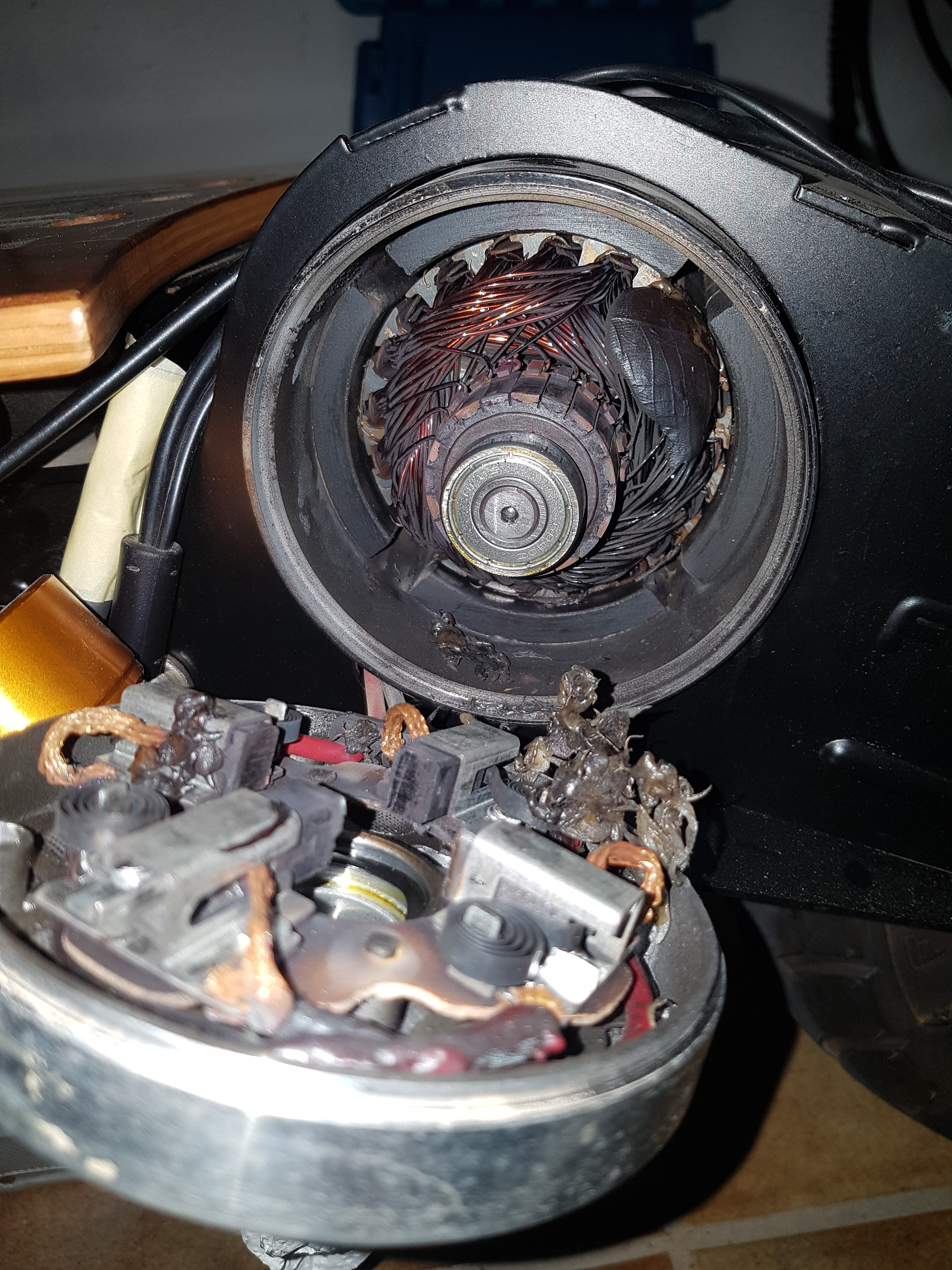 Für mich hört sich das an, als ob eine Wicklung im Lichtbogen verdampft ist, wenn das Geräusch aus dem Motor gekommen ist!