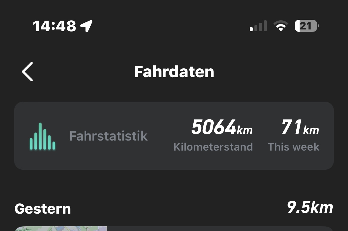 Ich habe mit meinem NIU MQi+ Sport, EZ 06/2020, aktuell 5064km runter. 1. Akku mit 74 Ladezyklen. Es kommen jetzt sogar täglich 40km drauf, weil ich dank neuer Dienststelle nicht mehr auf mein Auto bzw. die Bahn angewiesen bin