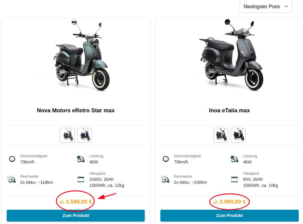 Irgendetwas ist da bei der Preissetzung auf der NM-Webseite aber fehlerhaft: Auf der Eingangsseite wird der SLI-7 Max mit 3.799 € angeboten. Klickt man auf "Zum Produkt" ändert sich der Preis plötzlich auf 3.999 €, also 200 € mehr. Nimmt man den Roller in den Warenkorb bleibt es bei 4.000 €.