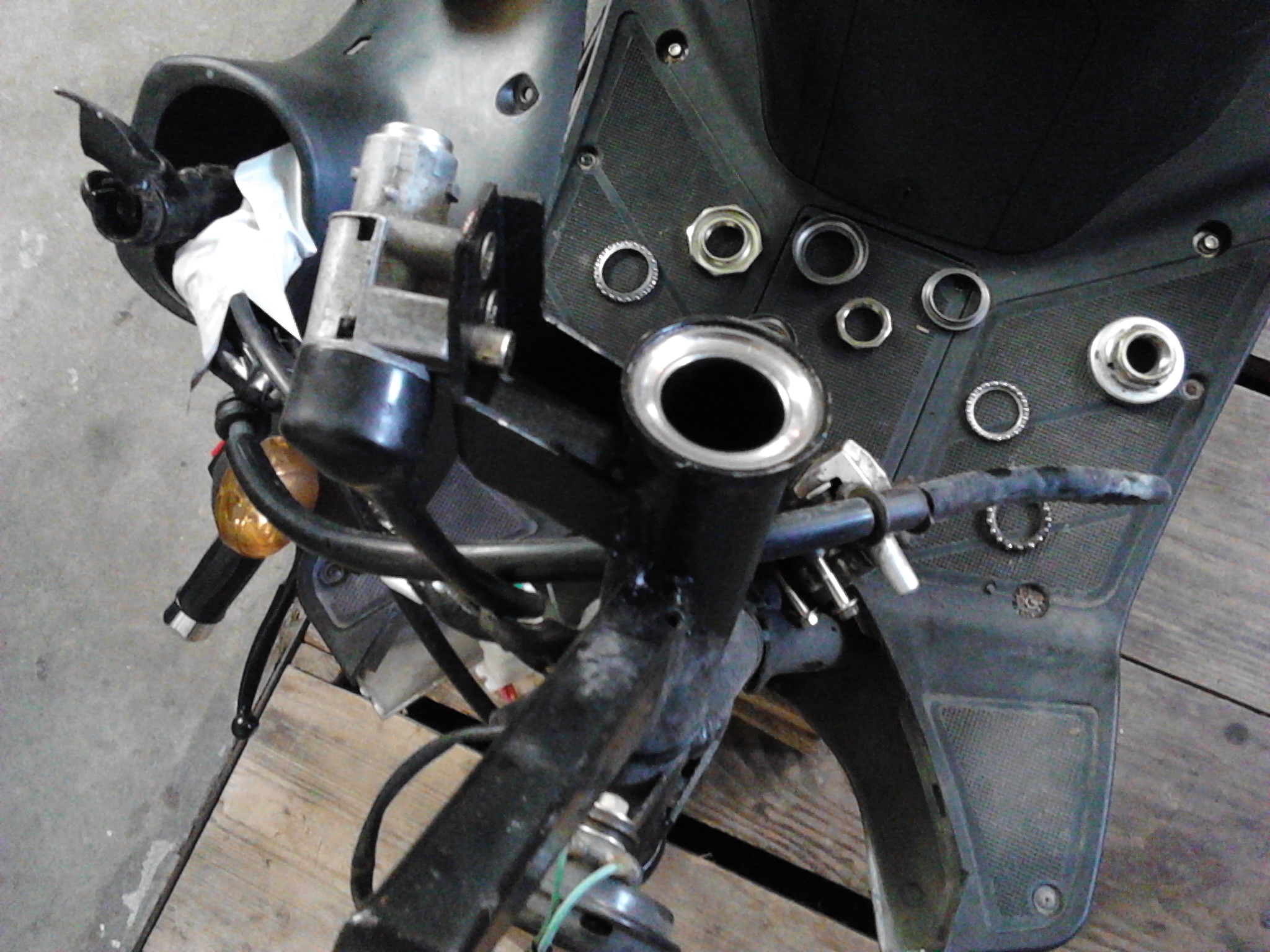 Lagerring im Lenkkopf (Rahmen): Meisel schräg von unten ansetzen und nach oben austreiben.Da ist ja ein Überhang!Das bitte im 360°verfahren.