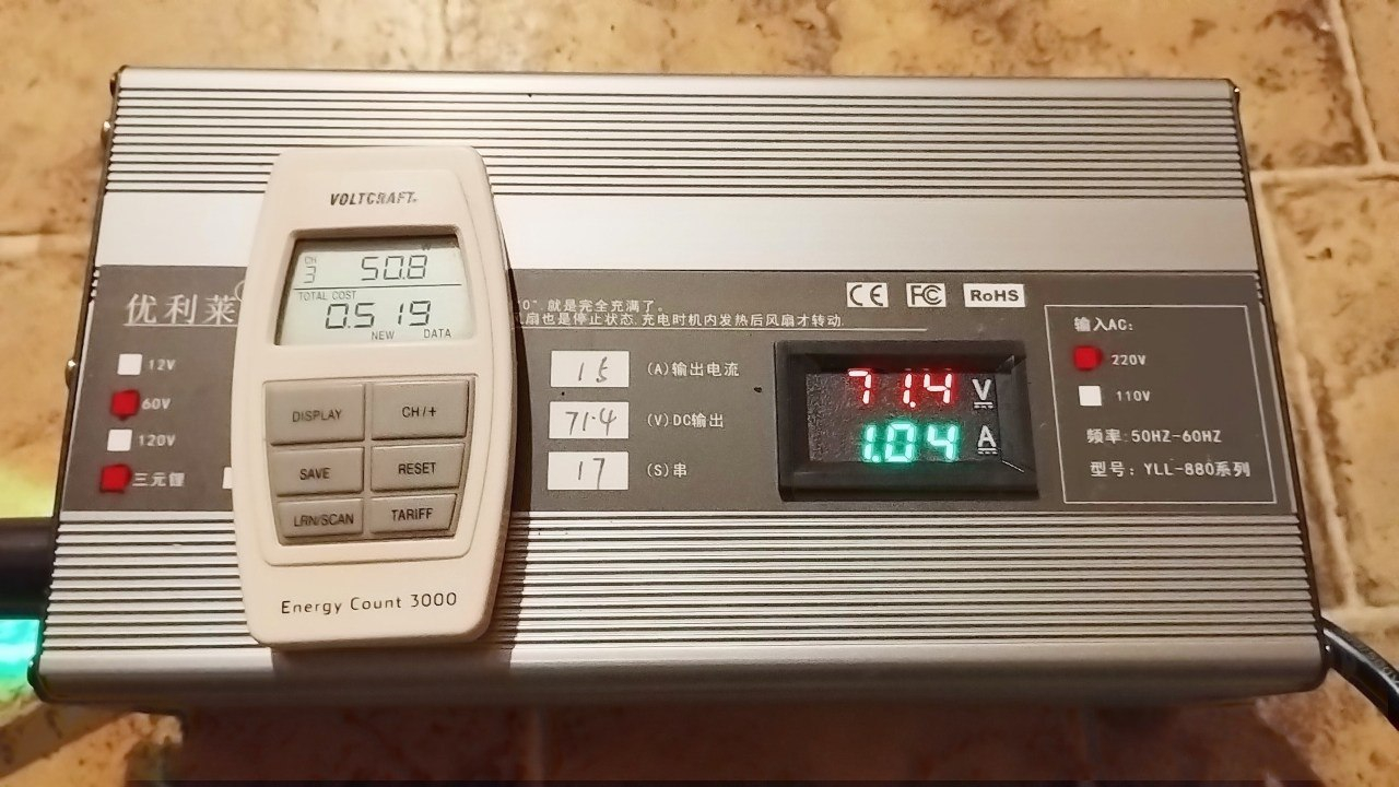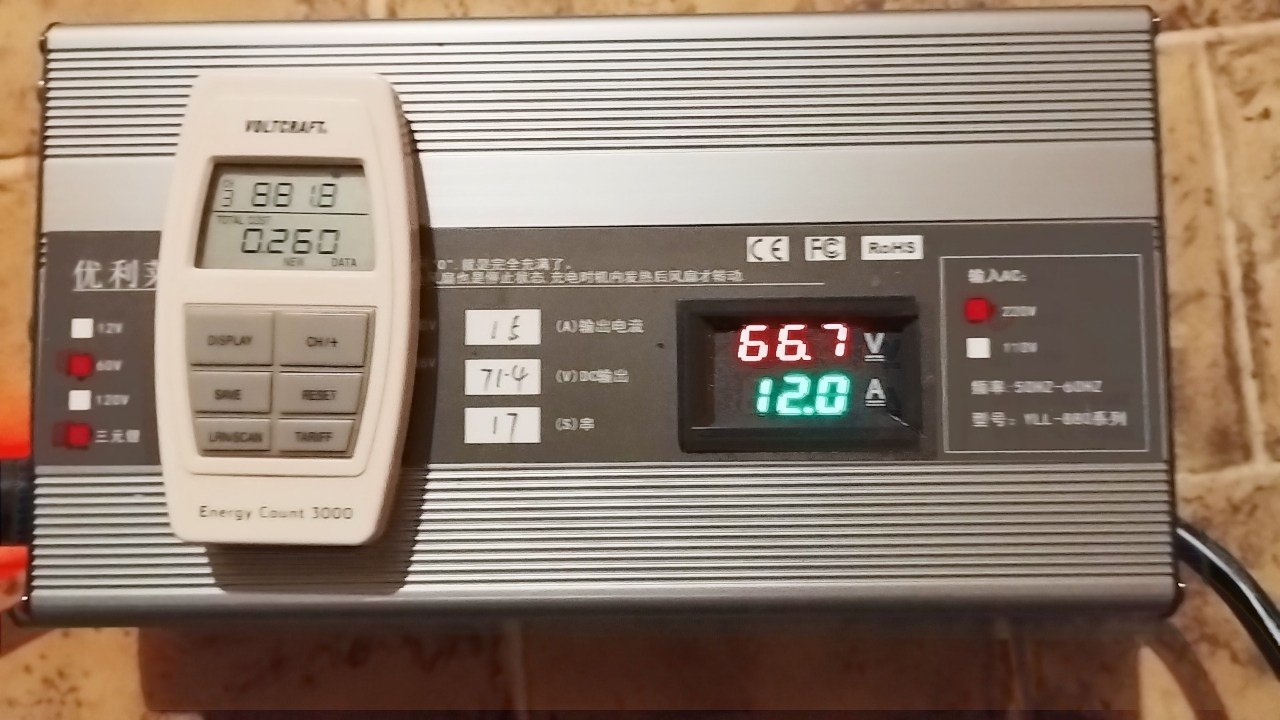 Das ist ganz normal während der anfänglichen Konstantstrom Ladephase! Es is ja keine Konstant-Leistungsphase… DEI Batteriespannung steigt ja an, je voller der Akku wird. Gemäß P=UxI steigt somit die Ladeleistung an bis Richtung Ladeschlussspannung.guewer hat geschrieben:Seltsam bei dem Ladegerät ist, dass die Ladestärke während des Ladevorgangs nicht kontinuierlich abnimmt, indem die Amperezahl zurückgefahren wird, sondern, im Gegenteil, gegen Ende immer weiter zunimmt (Amperezahl bleibt bis zuletzt bei 12 A)! Stresst das nicht den Akku übermäßig und verkürzt dessen Lebensdauer?