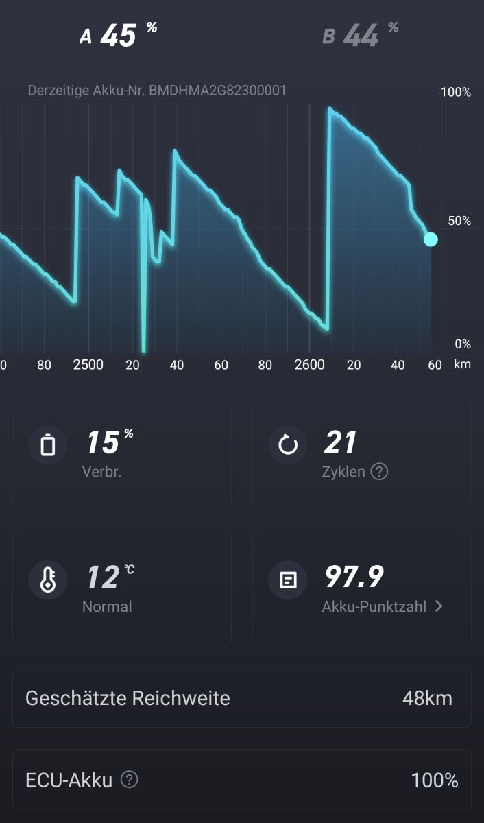 Also ich habe den Akku jetzt mal 4 Tage angesteckt gelassen und bin etwas entsetzt was die EVO ohne bewegt zu werden aus den Akkus saugt.Thomas-NIU hat geschrieben: Di 31. Okt 2023, 09:45 Hier mal meine Erfahrung mit langen Stillstandszeiten wenn die Fahr-Akkus im Fahrzeug verbleiben. Ich glaub einfach dass mein Akku auf Steckplatz B eine höhere Selbstentladung hat. Warum auch immer. Das BMS kann das wohl erst später auf der Fahrt korrigieren und dann geht es bergab mit der Ladung. Der Akku ist zwar im Fahrzeug, bei dem Vergleich, aber hängt nicht am Netz. Die Prozentanzeige stimmt natürlich nur für den Schlechtfall.