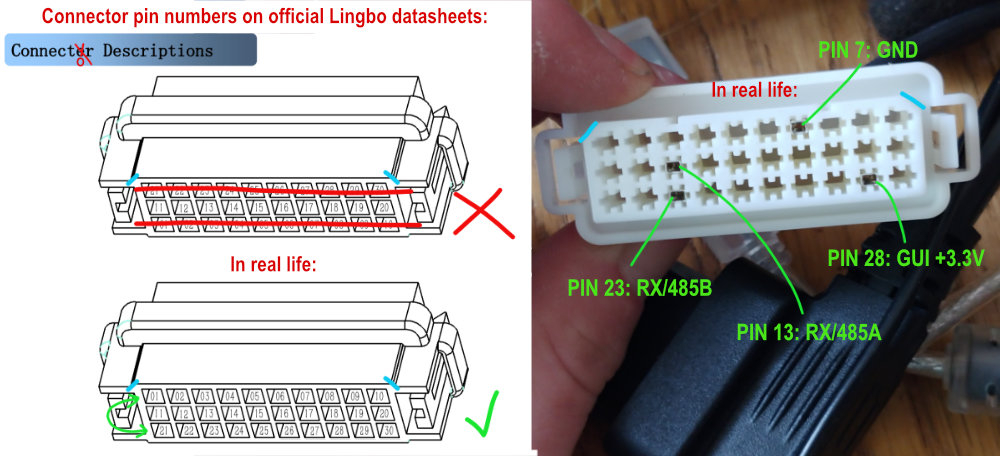 Hallo, ich glaube die Belegung der PIN`s laut Lingbo Manual ist doch richtig, weil es nicht die Steckseite in den Lingbo Controller zeigt sondern die Anschluss Seite der einzelnen Adern zeigt. Bin ich auch schon mal drauf reingefallen ... Pin Beschriftung 28 müsste eigentlich 29 heißen ... siehe mein Foto ... VG