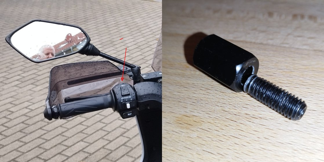 Schraubadapter. In den Schaltergehäusen gibt es nämlich oben noch eine Öffnung, die mit einem Plastikstopfen verschlossen ist. Die Adapter dort rein, die Spiegel obendrauf und das ganze mit gaaaaanz viel Gefühl festziehen. Ich hatte vorher andere Teile aus einem anderen Shop, die waren zu weit ausgebohrt und die Gewinde rissen unten ab, aber diese Teile hier habe ich selbst im Einsatz. Man gewinnt zwar nur 2 cm Breite je Seite, aber bei mir macht das viel aus.