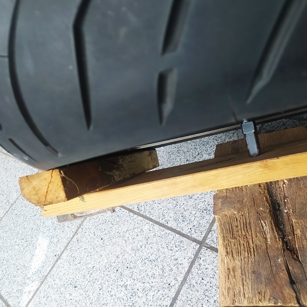 Ich habe das durch ein einfaches Brett auf der Rückseite der Felge erreicht an dem die Achse ansteht: