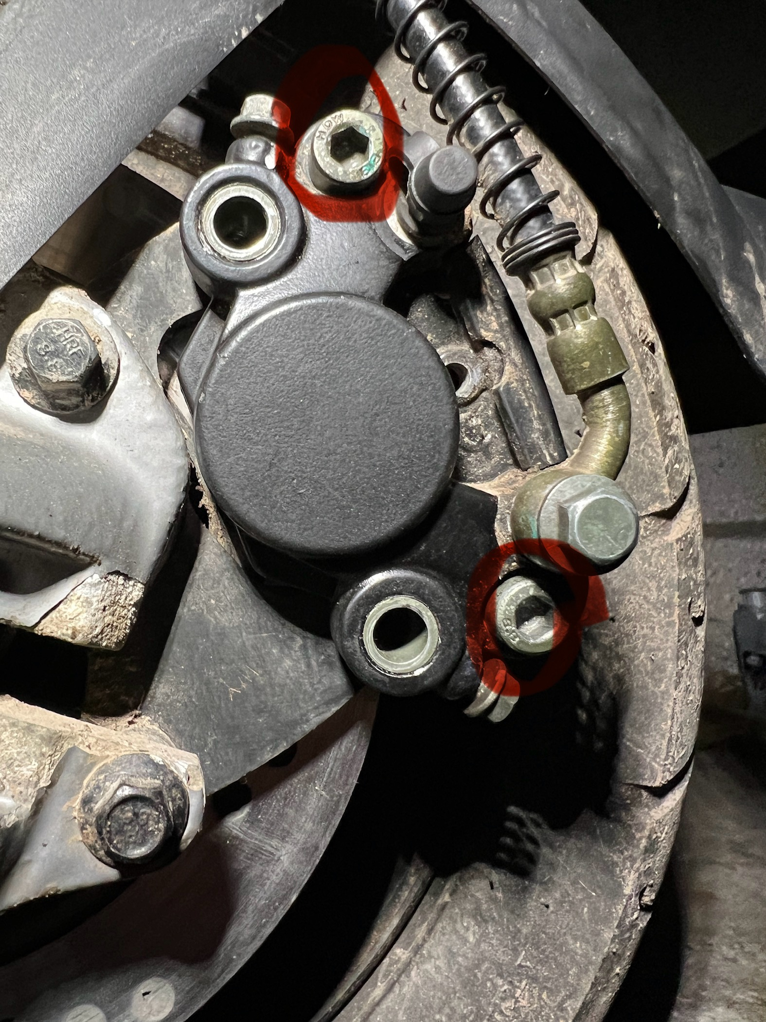 Ich habe die beiden rot markierten Schrauben fälschlicherweise geöffnet. Als mir dann die Suppe entgegen gelaufen ist, habe ich die wieder drauf gedreht. Daher auch das Thema mit der Bremsflüssigkeit/Entlüften.