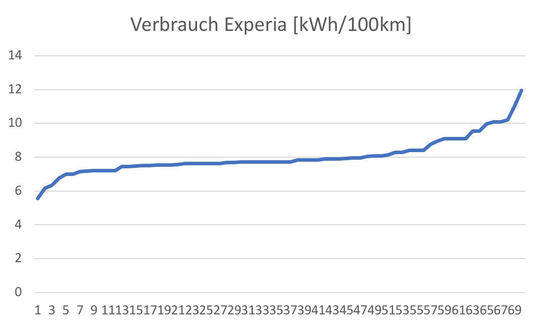 Puh, das mit dem mittleren Verbrauch hat mir keine Ruhe gelassen. Habe mal alle meine Ladungen aus Spritmonitor exportiert und aufsteigend nach Verbrauch sortiert. Also x-Achse die Ladevorgänge sortiert & durchnummeriert und y-Achse der Verbrauch. Folgendes Bild ergibt sich daraus: