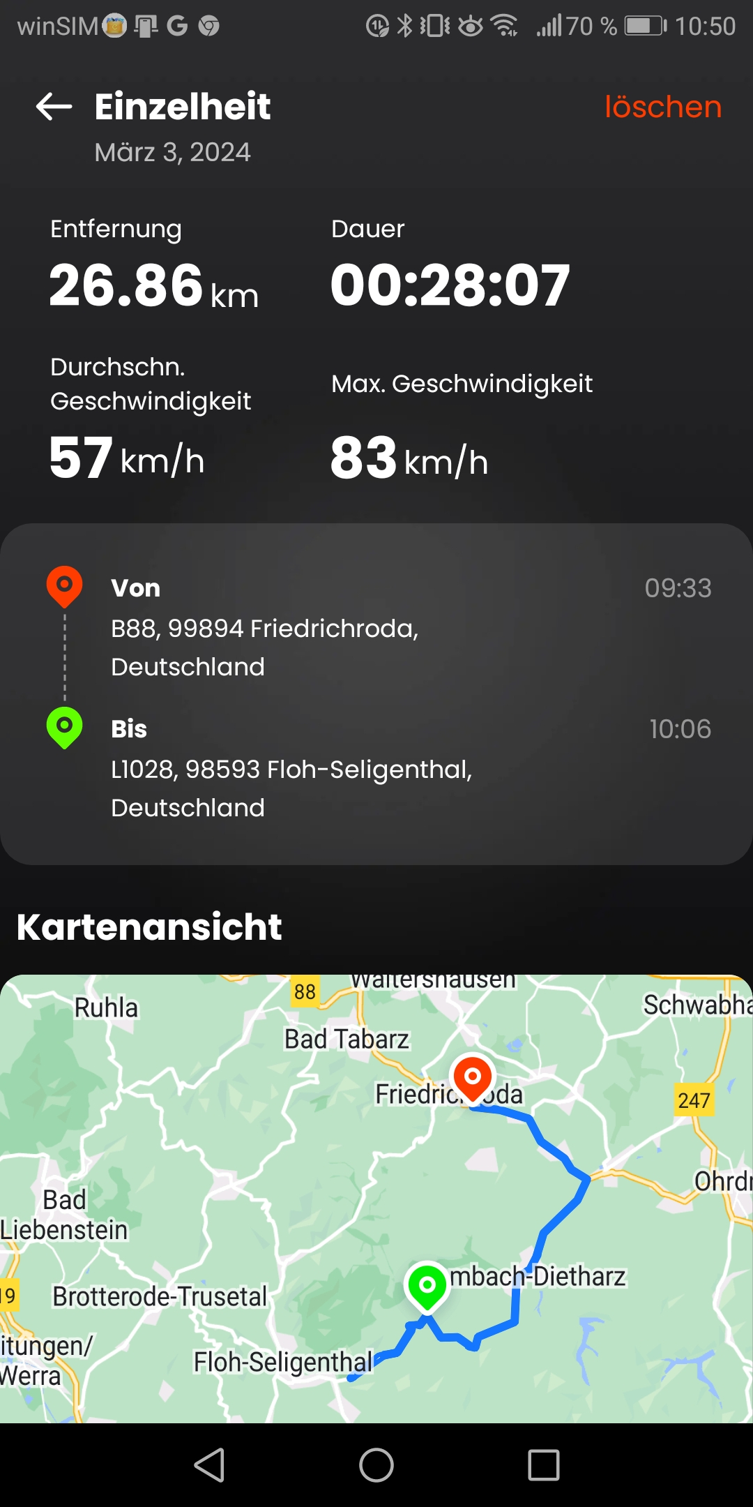 Habe den EK3 mit 2 Stück 72 Volt 36 AH Akkus. So genau kann ich die Reichweite nicht sagen weil ich wenn es geht vermeide unter 20% oder besser 30% Ladung herunter zu fahren. Normalerweise lade ich auch nur zwischen 82% bis 90% Und nur monatlich zum Balancieren bis 100%. Der Roller muss immer draußen stehen und wohl durch die Feuchtigkeit hat die Helligkeit des Displays abgenommen. So nutze ich die Tachometer App um die Geschwindigkeit zu sehen. Hier nun 2 Screenshots einer Fahrt durch den Thüringer Wald von heute morgen. Temperatur zwischen 6,5 und 10 Grad.Dampfhans81 hat geschrieben: So 3. Mär 2024, 10:08 Nachdem ich jetzt ein ungefähres Bild zu der Reichweite der Niu habe interessieren mich eure Erfahrungen zu dem Thema im Bezug zur Sk3.