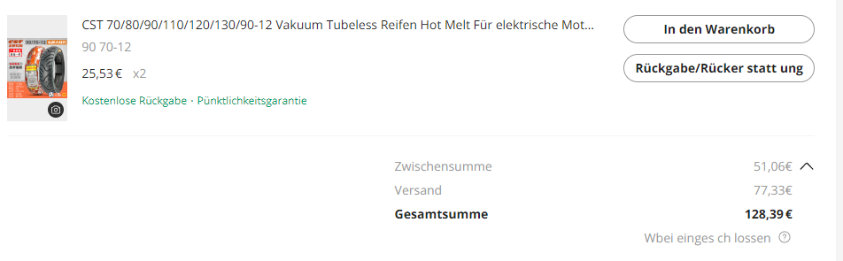 https://de.aliexpress.com/item/10050052 ... pt=glo2deu Ich habe jetzt für 2 Reifen ~51€ bezahlt was erstmal günstig ist. Zusätzlich kamen leider noch ~77€ versand oben drauf.