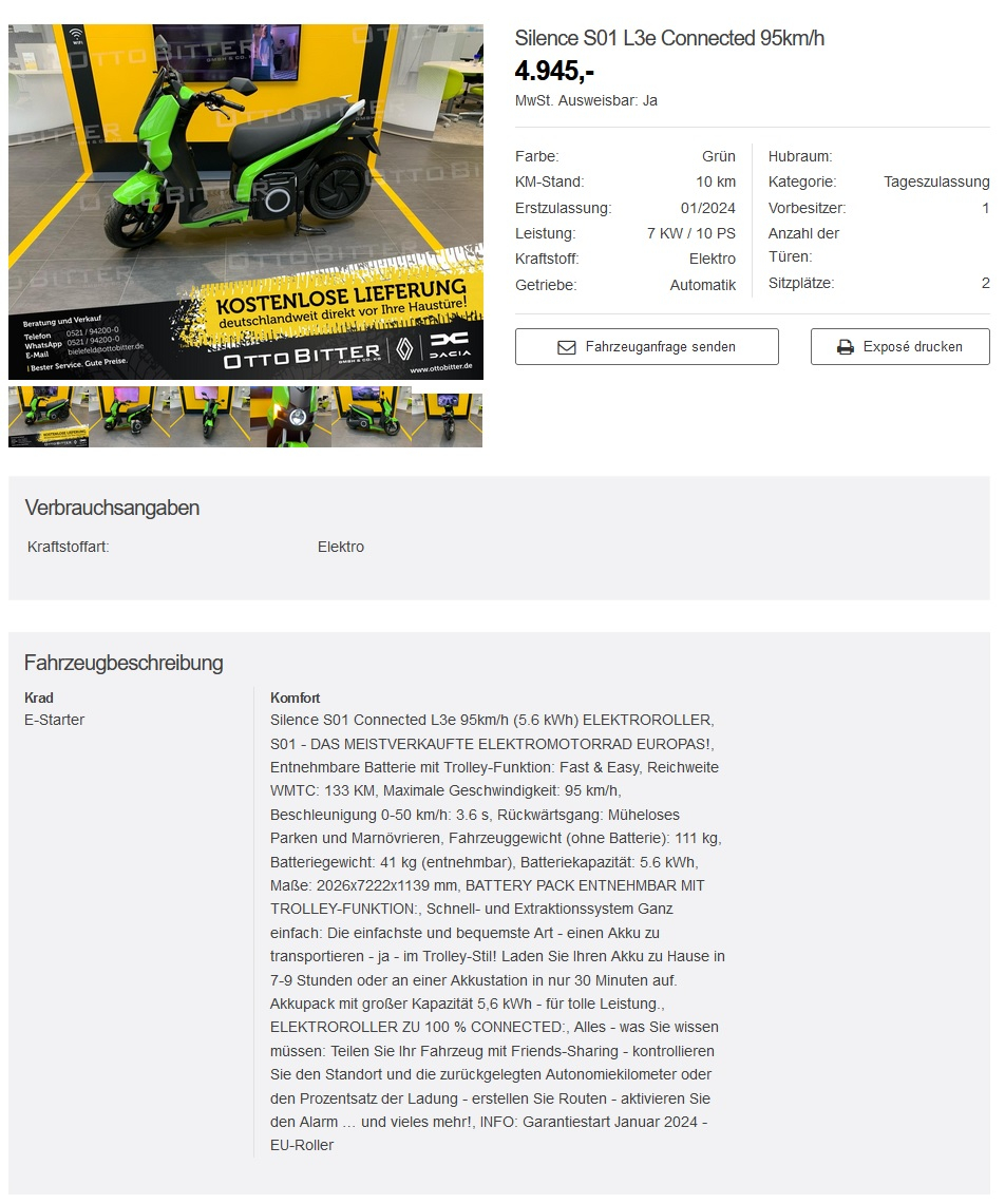 Ich war gestern in Bielefeld unterwegs und habe zufällig in den Showroom eines Renault/Dacia Händlers geschaut. Dort standen tatsächlich ca 70 Silence S01 in allen Farben rum. Das Beste daran: die wollen keine 5000€ für einen S01 L3e Connected.