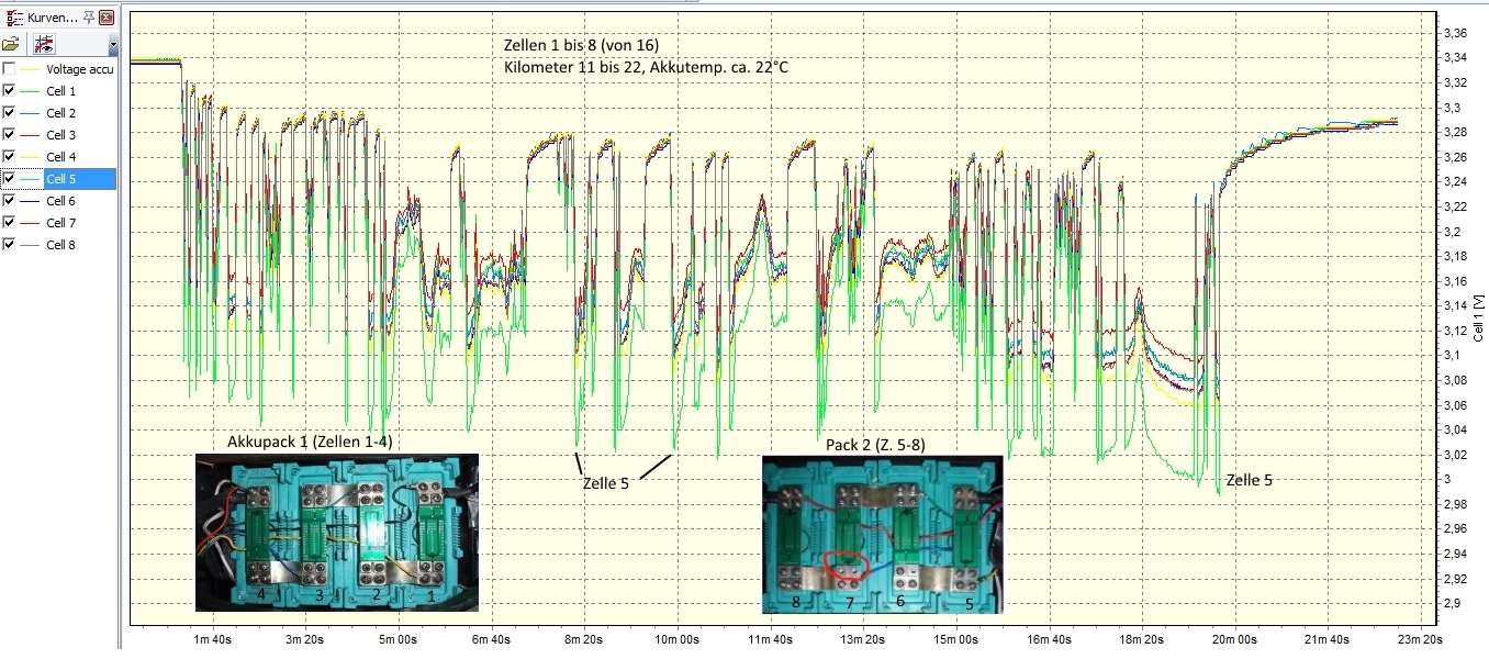 Ja, die Zelle 5 scheint tatsächlich mit etwas höherem Innenwiderstand "gesegnet" zu sein als die anderen gemessenen. Die Frage ist, wie das nach ein paar km Fahrstrecke dann aussieht: ist da die Nr. 5 immer noch die tiefste, oder wird eine andere Zelle mit kleinerer Kapazität als Nr. 5 vielleicht früher die Flügel in Richtung 2,5V strecken?