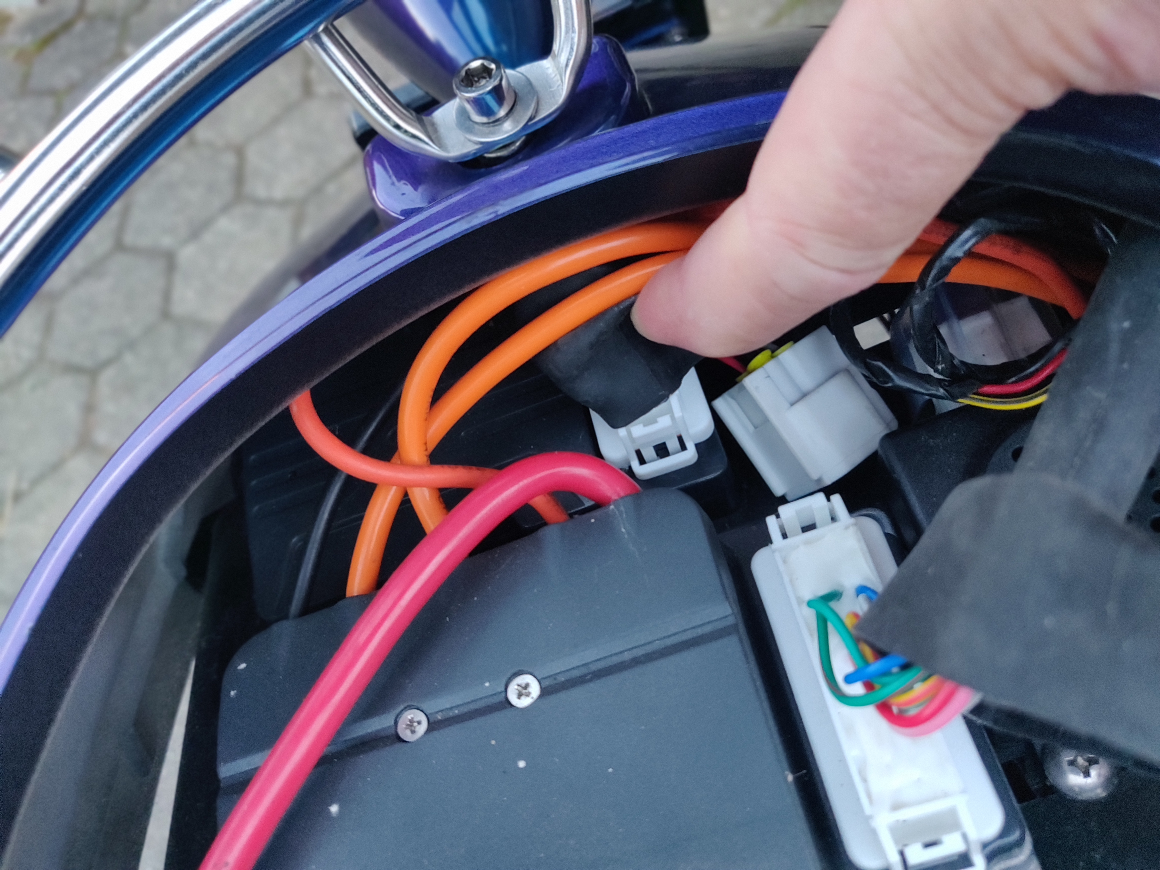 Im Roller sind diverse Geräte verbaut, da muss ich noch ein wenig Forschung betreiben. Oben hinten sitzt die Sirene der Alarmanlage, ein kleiner Kasten mit orangen Kabeln und noch ein kleiner Kasten. Da kann von unten gut Dreck/ Wasser ran, da gibt es gleich noch ein passende Verkleidung.
