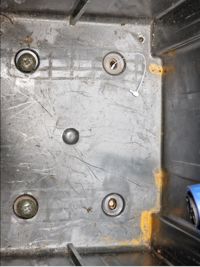 Denn 2 der Schrauben waren festgerottet. Warum? die Schrauben enden unten in einem Flech im Spritzbereich, welches sehr rostig ist. Bei vielen Dingen haben die Designer witgedacht und die Schraubenköpfe sind unten im Spritzbereich und die Gewinde ausserhalb. Hier ist es umgekehrt, und so sieht das von unten aus: