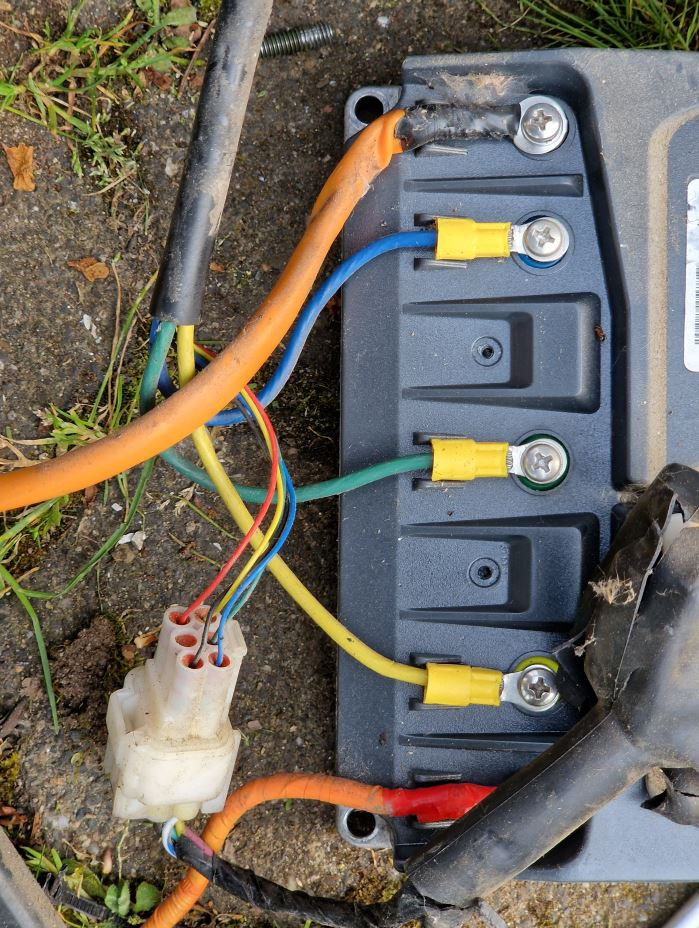 Die Motorleistungkabel haben keine Stecker/Kupplung, sindern sind direkt am Motortreiber festgeschraubt: Hier kann man nix falsch anschließen, alles schön farbig kodiert: Nachdme man die Gelöst hat und den Stecker für die Signalleitungen vom Motot getrennt hat, kann man sich an die Schrauben machen.