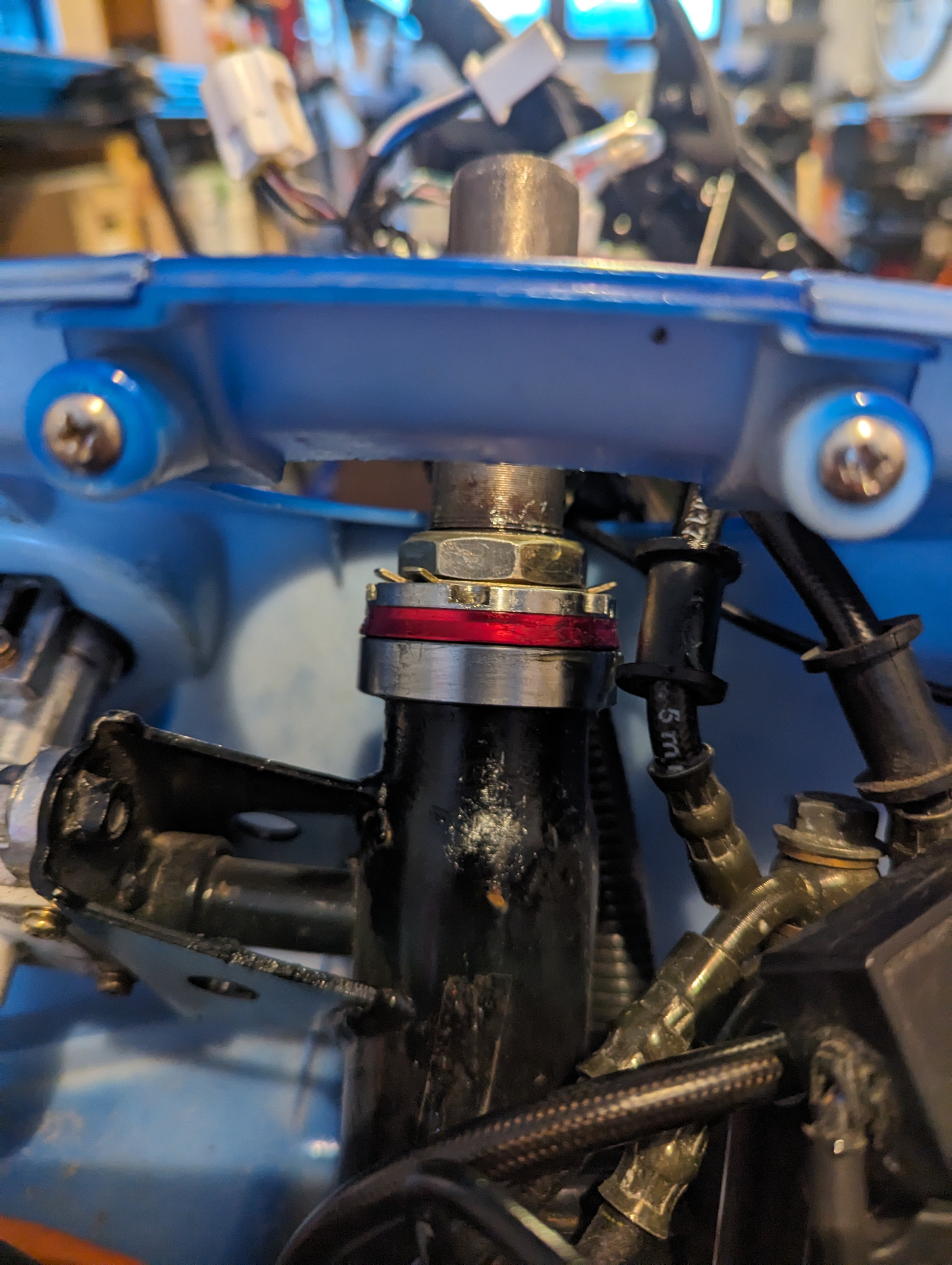 So, heute das Lenkkopflager gewechselt. Original (EZ 2022) verbaut war ein Kegelrollenlager 30x50x15,3 unten, aber oben nur ein Kugellager. Leider war die Kontermutter am Schaft derart festgeknallt, daß ich sie aufmeißeln mußte - auch das Lager war viel zu stark vorgespannt, kein Wunder daß es schon kaputt war. Der neue Lagersatz hat nun auch oben ein Kegelrollenlager, das zudem von der Qualität her recht gut aussieht und eine Überfanglippe (rot eloxiert, siehe Foto) hat, damit an dieser kritischen Stelle das Spritzwasser besser abgehalten wird.