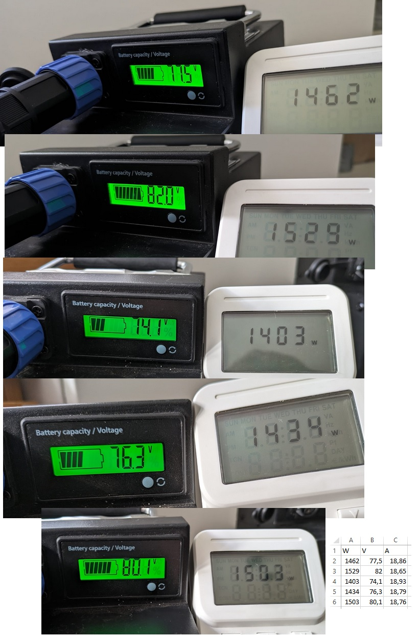 Ausgangsleistung ist aber 72V nominal/84V max, 18A kommt aber hin (rechnerisch laut Foto unten sogar fast 19A, ich ziehe einen Teil als Ladeverlust ab)