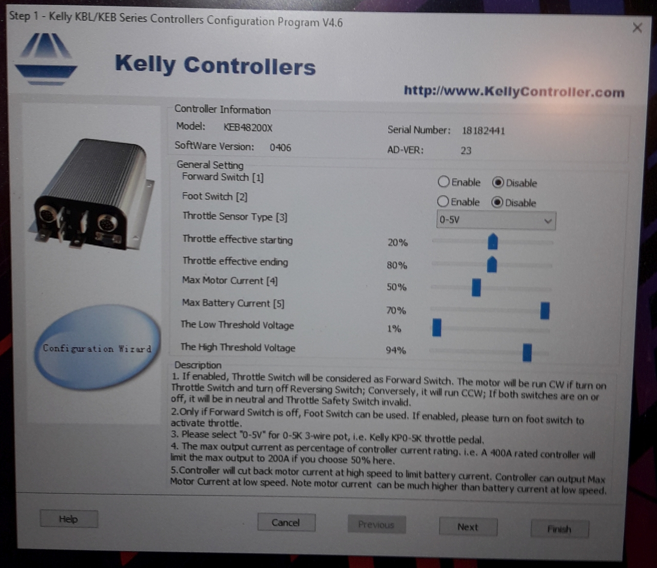 Die Software Version ist die 406 für KEB, anbei Bilder. Sehr ungewöhnlich finde ich, dass die Polpaare auf Seite 3 falsch eingestellt und ausgegraut sind. Aber Kelly sagt, die werden nur zur Drehzahlermittlung mit CAN Modellen benutzt und man soll sich keinen Kopf machen. Auf Seite 4 ist dann unten "Smooth". Rev check habe ich noch nicht verstanden, Auto identify wenn man das aktiviert taktet er alle drei Phasen beim Start durch. Bei mir hat er immer rot angezeigt und scheint nicht glücklich, jemand anders aus dem Internet hatte immer grün und war auch nicht zufrieden.
