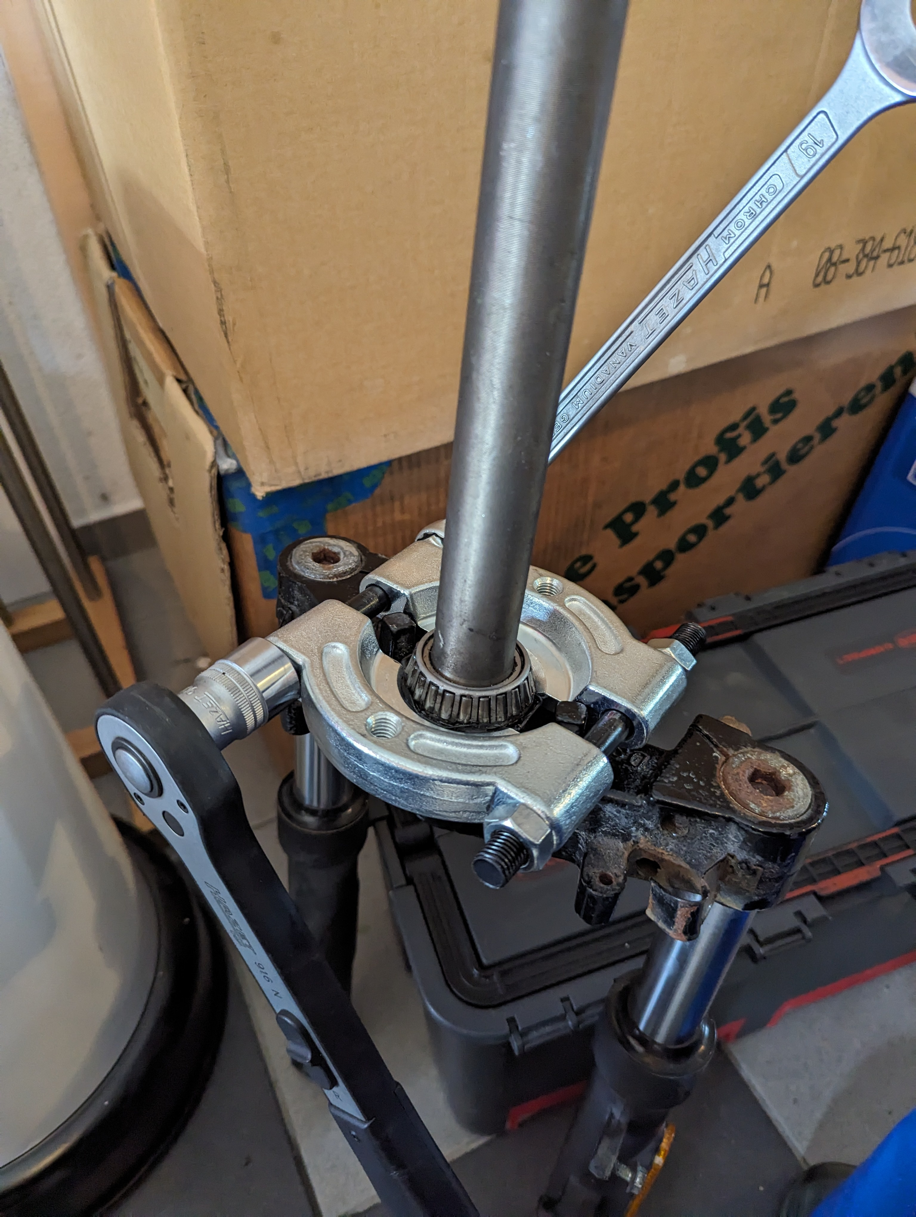 Das neue Lager oben (nun Kegelrollen- statt Kugellager):