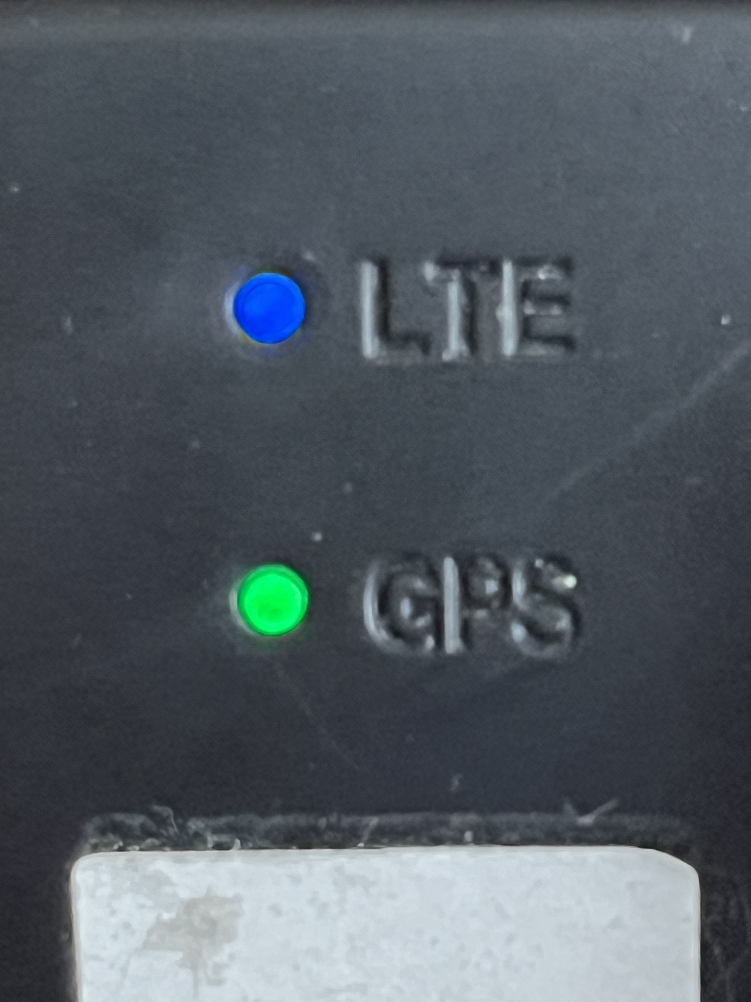 Die grüne GPS-LED leuchtet dauerhaft, die blaue LTE-LED blinkt alle 3 Sekunden.