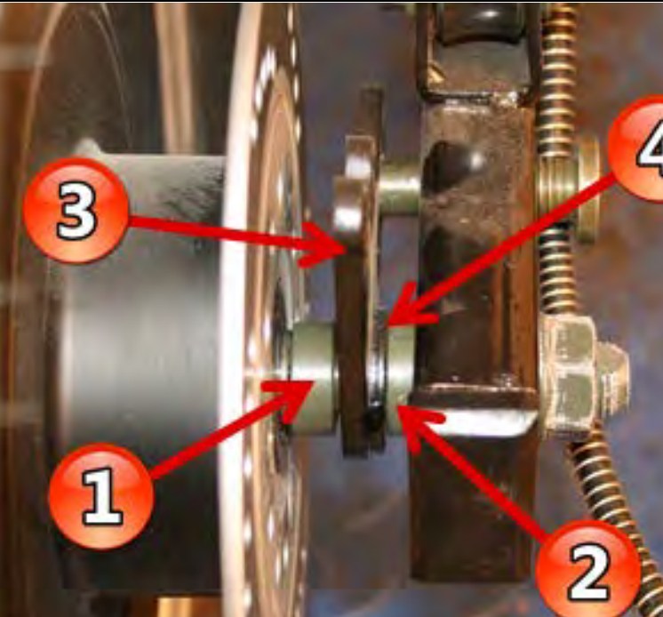 Dein Bild ist etwas schwierig einzuschätzen. Mir kommt Nr1 schon etwas komisch vor. Normalerweise gehört auf die Motorachse als erstes eine Unterlegscheibe mit abgeflachter Bohrung, welche sich am Übergang von "abgeflacht zu rund" abstützt und das Gegenlager zur Achsmutter bildet.