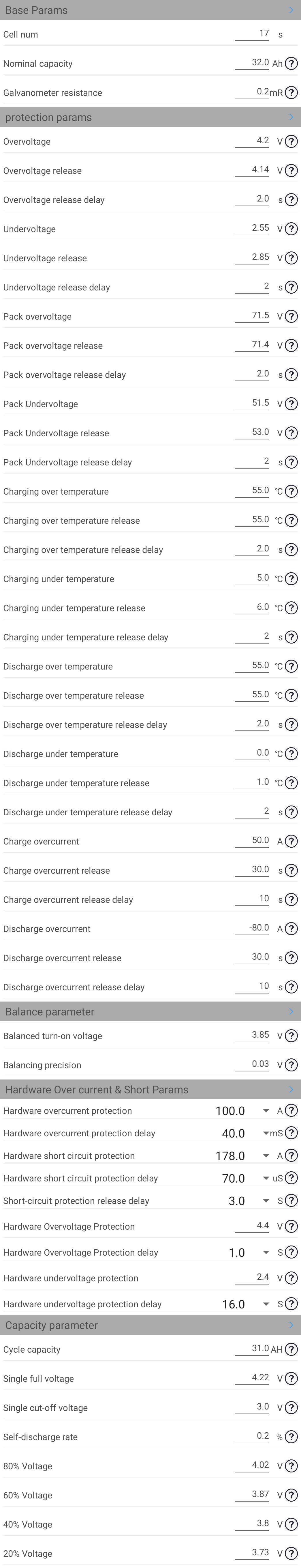 ich würde zunächst einmal nachmessen (mit einem guten Spannungsmessgerät), ob es Differenzen zwischen der Zellspannung eines Blocks gemäß BMS und Messgerät gibt. Da geht natürlich auch mit der Gesamtspannung. Gibt es Abweichungen zwischen Volt des BMS und des Messgerätes? Beim JK BMS kann man das BMS in den Einstellungen sogar kalibrieren. Ich denke mal, das geht bei Deinem nicht, folglich muss man die Werte entsprechend der Abweichung anpassen. Beim überfliegen Deiner Werte würde ich die Under- und Overvoltage mal anpassen. Die Werte scheinen mir beides etwas zu hoch zu sein, mit 4,3 und 2,8V auf 4,2 und 2,55V z.b.