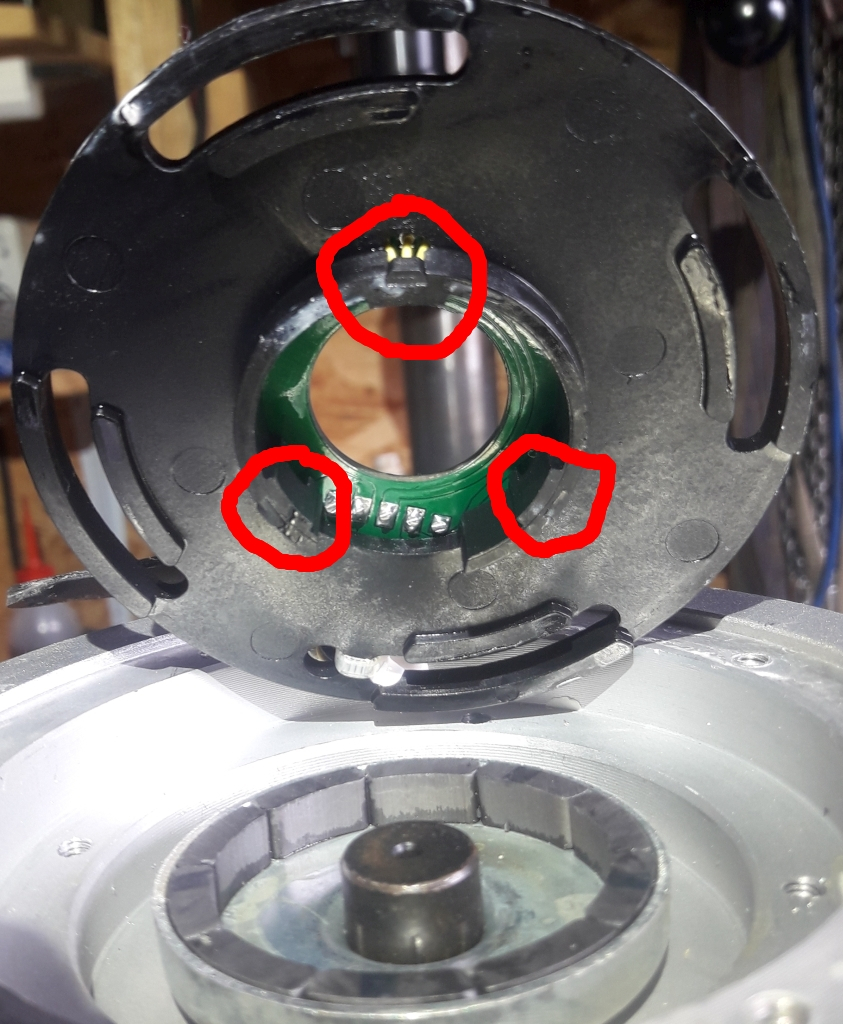 Jetzt habe ich hier diesen Mittelmotor. Die Hallgeber sehen symetrisch verteilt aus (unteres Bild, einer oben, 2 Verdickungen nach innen bei 8 und 4 Uhr) , sollte ich Glück haben und ich kann den Sabvoton 72150 dafür nehmen? Gibt es empfehlenswerte kleinere Alternativen? Ich wollte es mit dem Batteriestrom gar nicht völlig übertreiben und 3kW bei 48V reichen eigentlich...