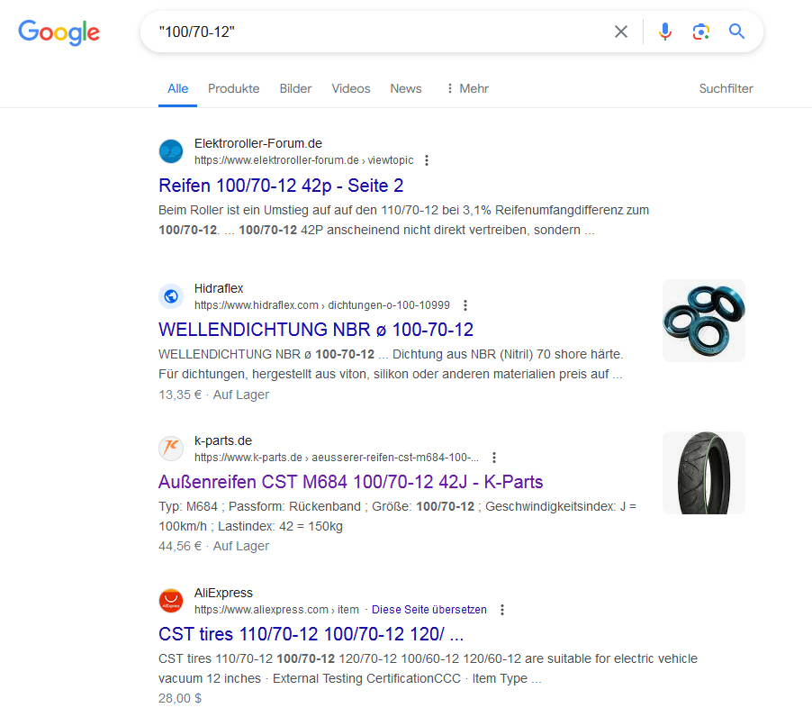 Jetzt mal im Ernst: ich habe das Suchergebnis deshalb hinzugefügt, weil dort ein Preis von 44,56 € angezeigt wird. Das ist wohl eher realistisch als 0,82 €. Ich habe jetzt keine Vergleichsmöglichkeit mit anderen Reifen in der Größe 100/70-12 42p, aber sicher kann hier der (oder die) eine oder andere mehr dazu schreiben. Jedenfalls gibt es offenbar nicht nur den Maxxis für das Vorderrad...