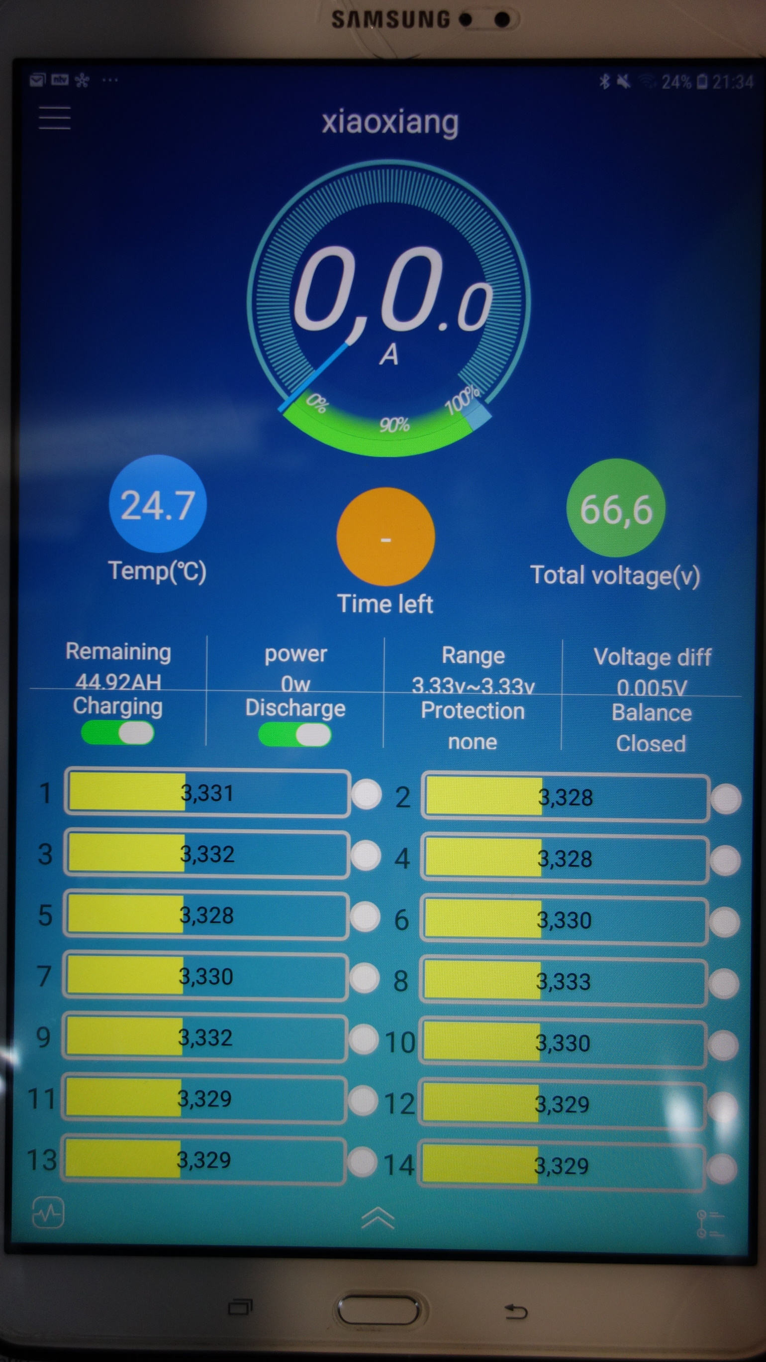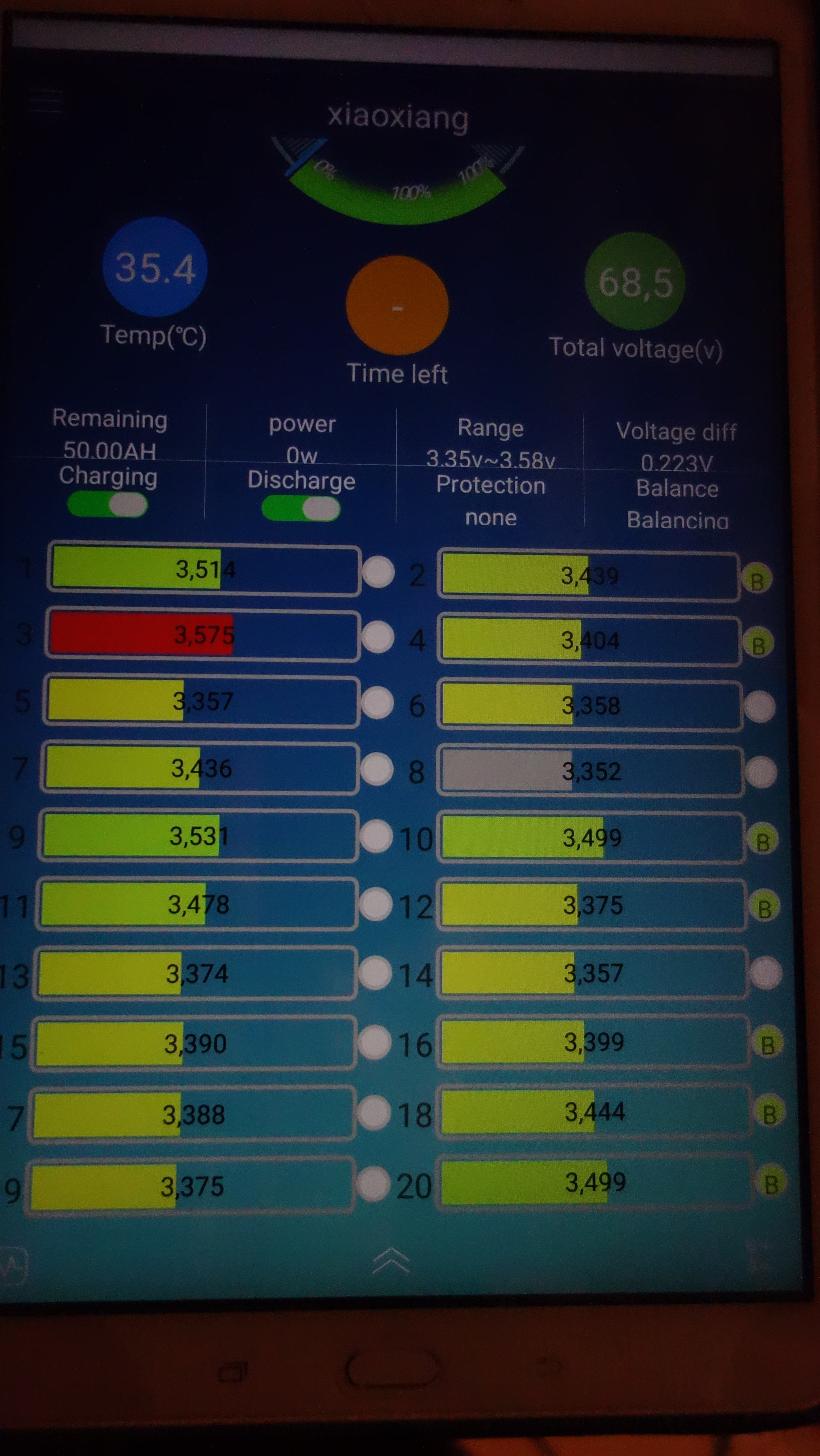 Der Akku ist noch einwenig debalanciert. Deswegen erreichst du auch keine 72V. Leider hat das JBD/Xiaoxiang BMS nur einen geringen Balancerstrom von 35mA. Jedenfalls hat die Abschaltung durch das BMS bei 3,6V, Zelle 3, funktioniert. Vermutlich wirst du, auch nach mehreren Ladevorgängen, nur auf 70V Ladeendspannung kommen. Das ist aber nicht schlimm - ist halt bei einem LFP-Akku so.