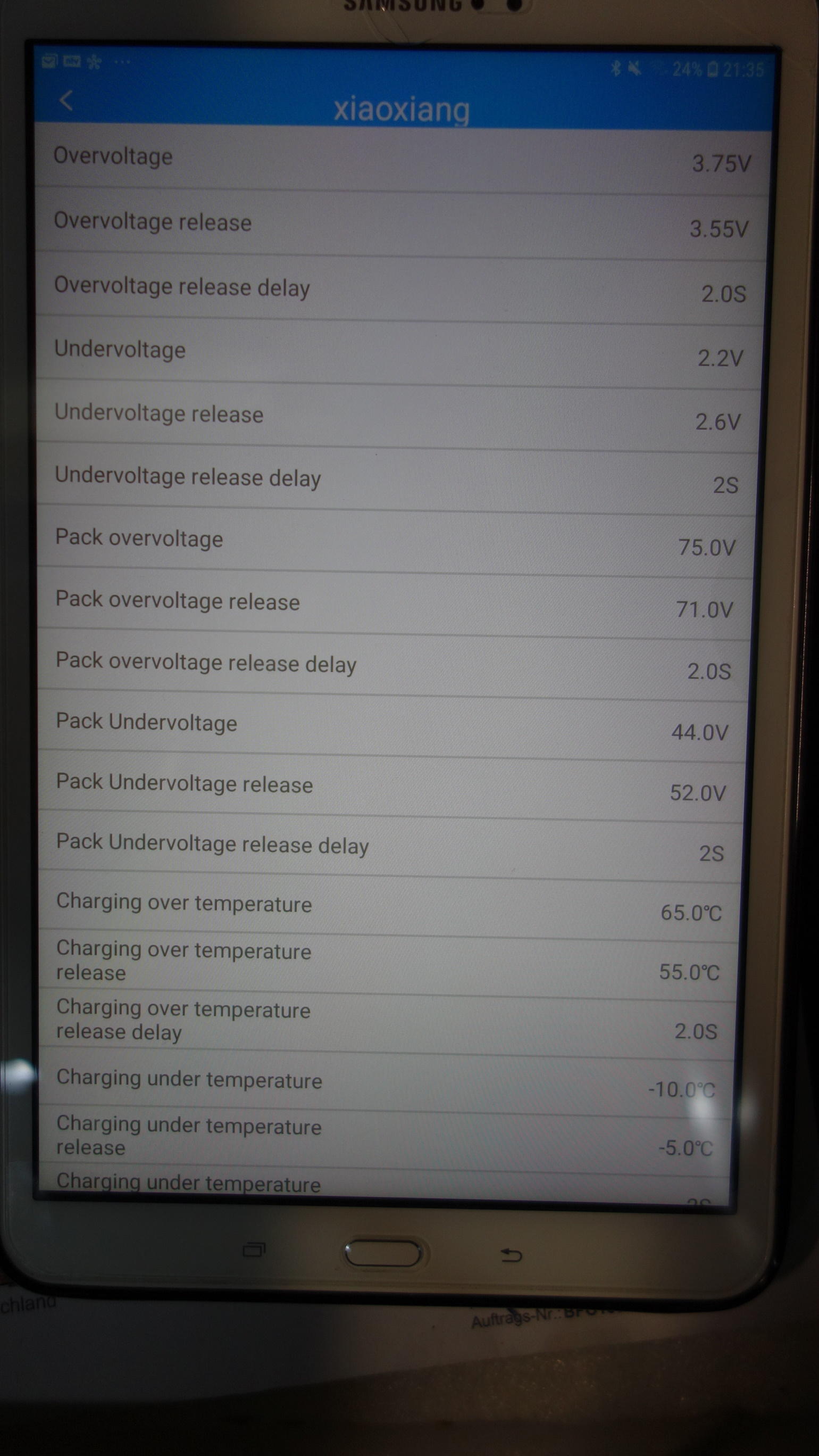 Danke für die Infodominik hat geschrieben: So 7. Jul 2024, 22:14 Das cell over voltage wäre mir mit 3,75V etwas zu hoch. Das Üack overvoltage mit 75V auch.