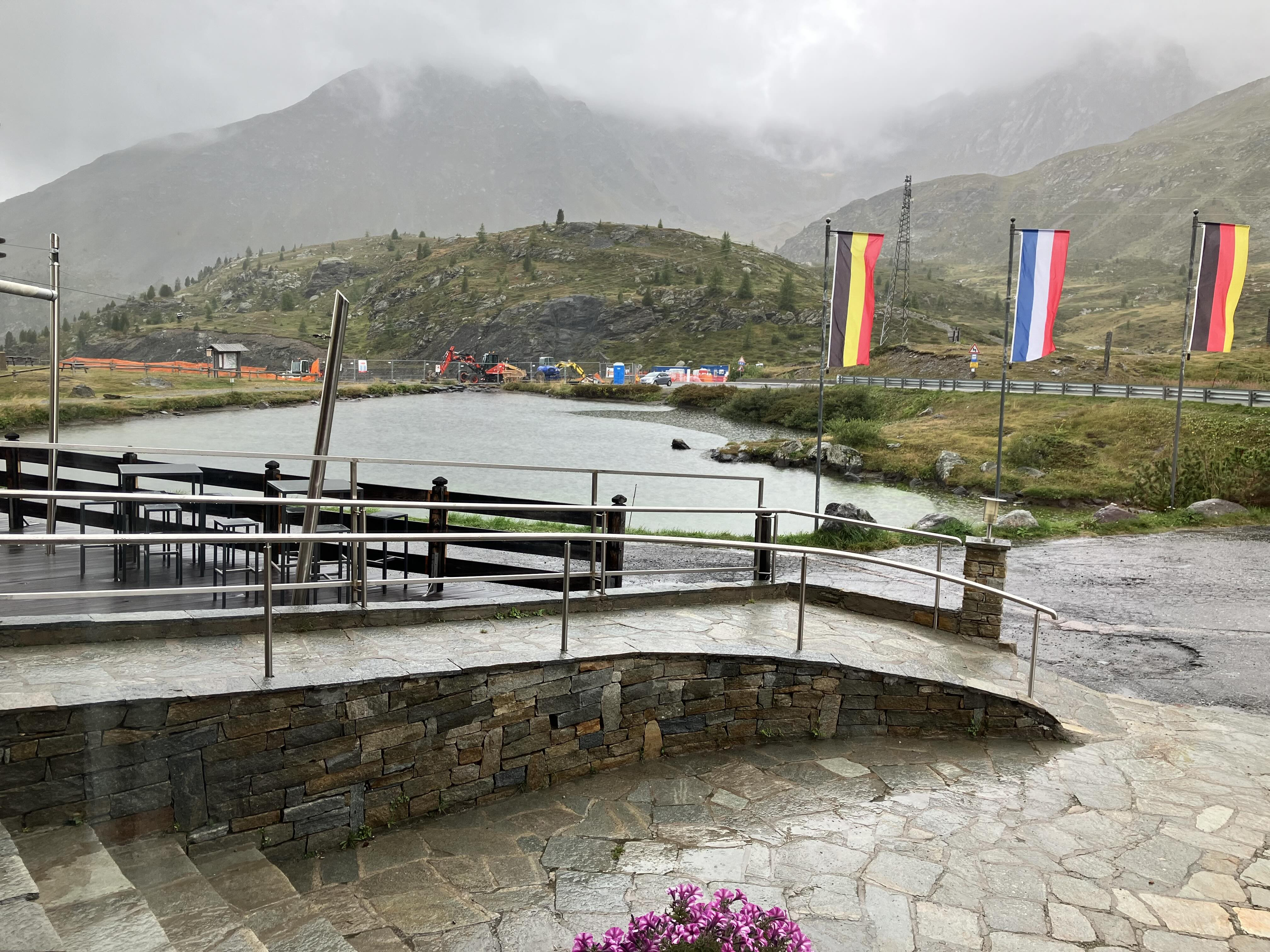 Retour Richtung Bormio, um ins Valditreno Richtung Livigno zum Grenzübergang zu fahren. Dort im Hotel vor der Grenze gefrühstückt, bald 2 Stunden strömender Regen 5 Stunden vor der Prognose. Wir warteten ab, bis dann der Regen in ein leichteres Nieseln überging.